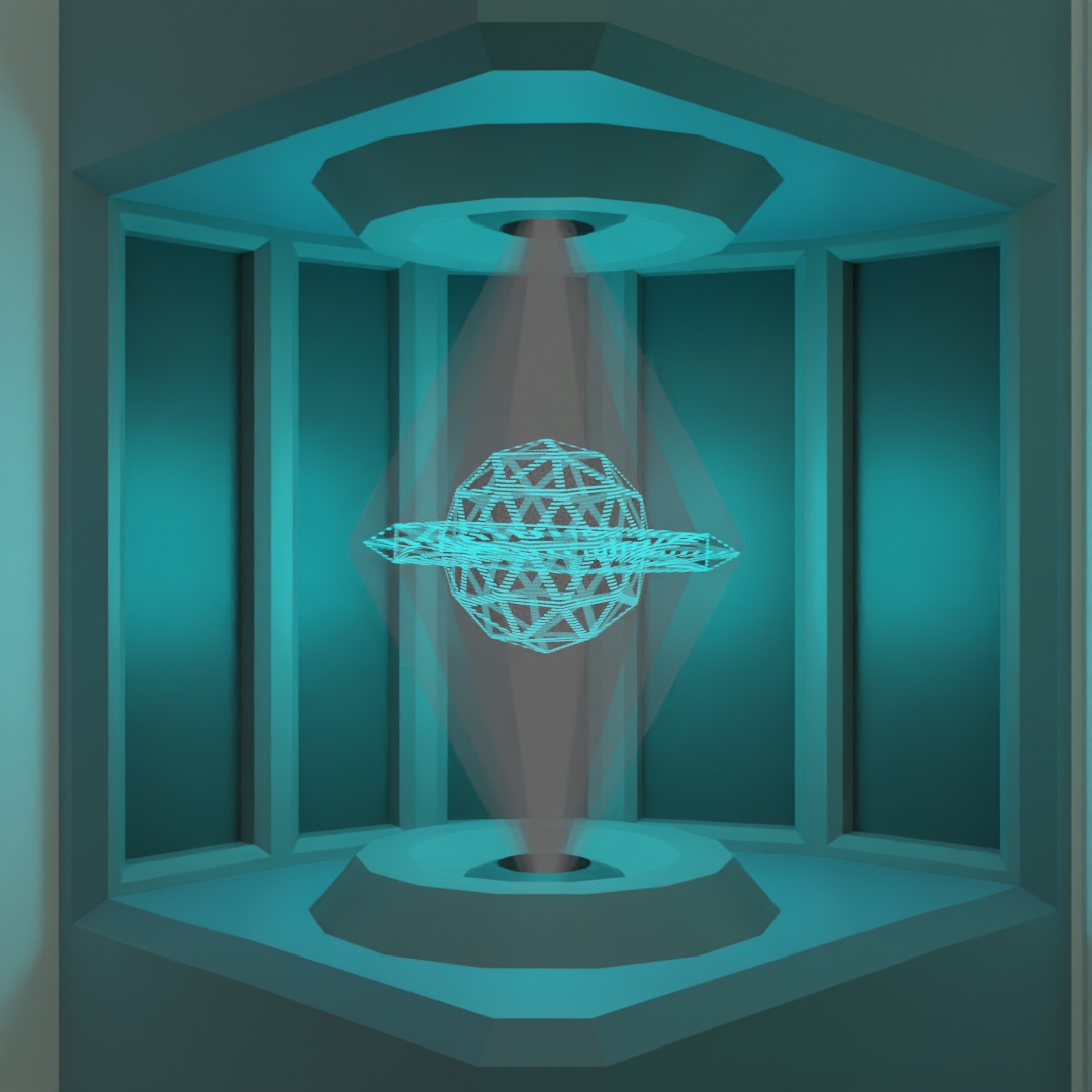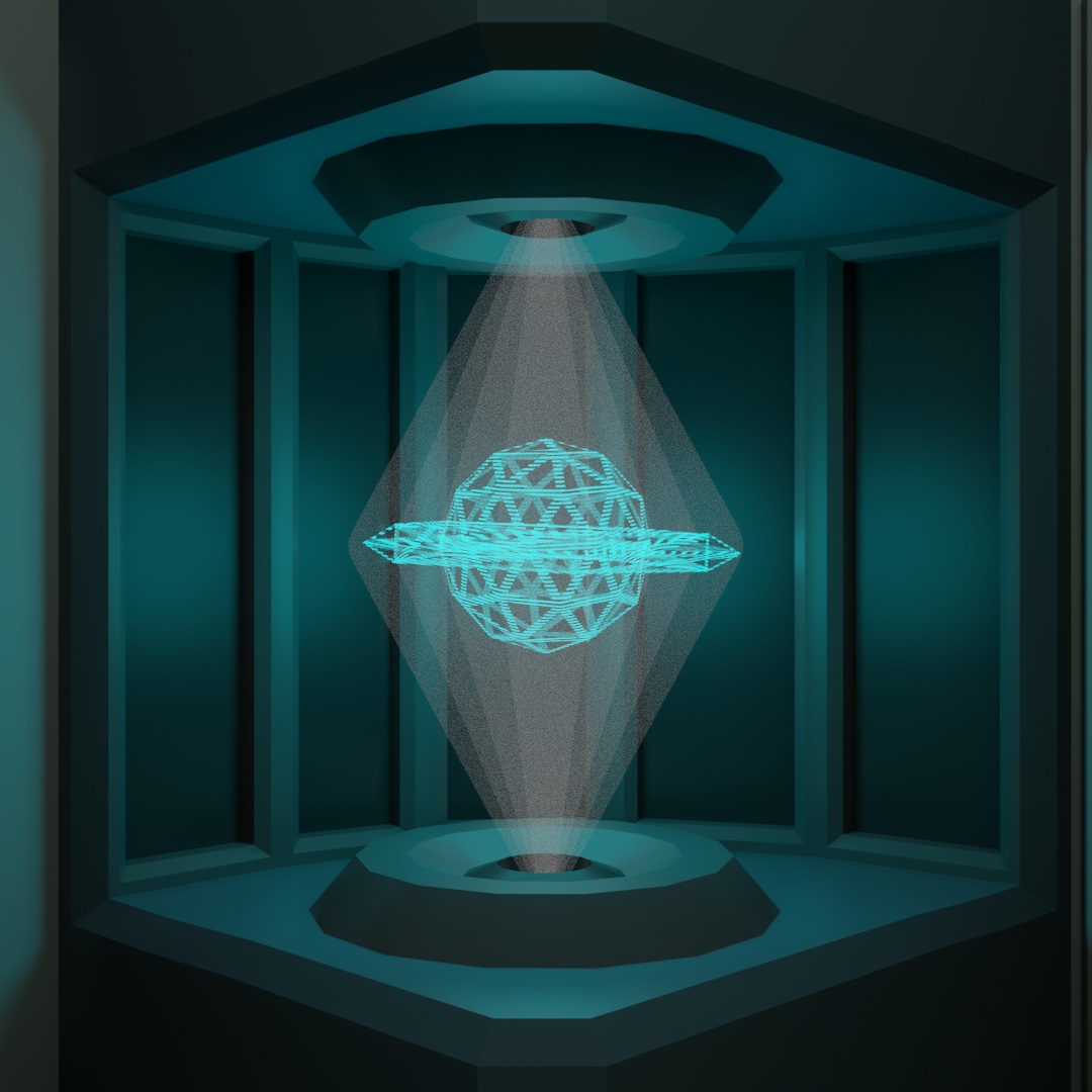 The hologram follows follows this lesson pretty closely, just some animated primitives with that material. I put some cones with a similar material in white around the hologram primitives to give it the effect that the hologram was being generated from the hole in the counter. I could only figure out how to make that work in Eevee. In Cycles I couldn't get the density of the cones to reduce, but also still emit bright white (I realize that might not be clear, I can provide more detials if people are interested).
