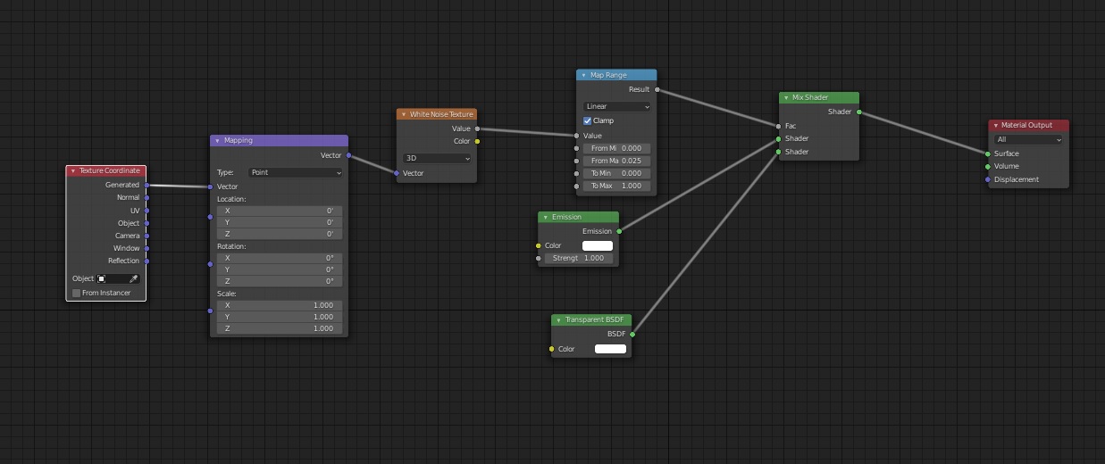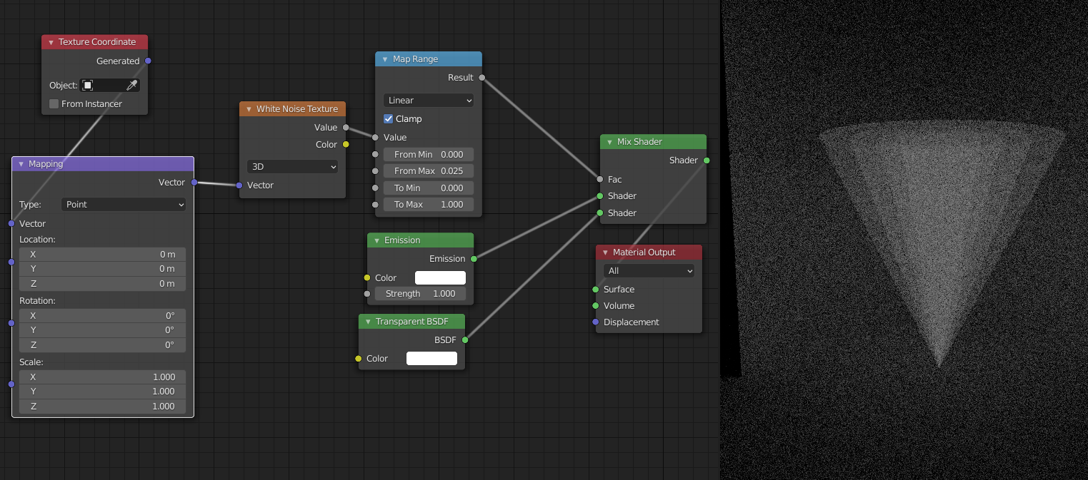 As you can see, the Cycles version looks more like smoke or something, more grey in color, and finer. On Eevee, if I lower the "From Max" value the hologram looks to less "dense", more granular, but on Cycles it just looks as though it gets darker. I played around with values, swapped the white noise texture with a high scale noise texture, even played around with a volume shader instead, but I still couldn't get the more granular but still white in color look that I can get in Eevee.