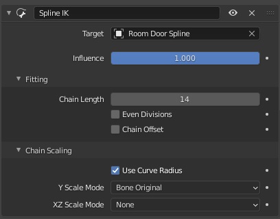 And, here is the setting on the Spline IK constraints, which are placed on the tails of the bone chains, Bone.014 and Bone.021. Switching between Bone Original and None for the Chain Scaling settings had the same desired effect of preventing the mesh of the doors from stretching, whereas the other options did deform the door meshes in undesired ways. I'm not sure which one is more appropriate since they seemed to do the same thing for me, but I'm sure there is some reason/cases to use one over the other, so you may need to play around with those settings to find the one that fits best.