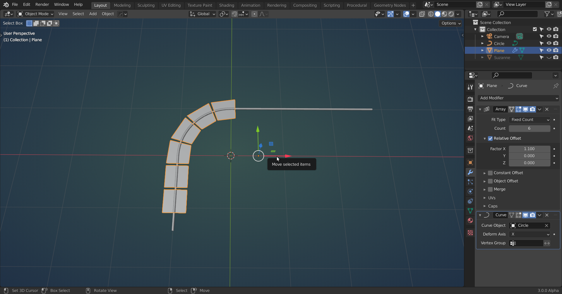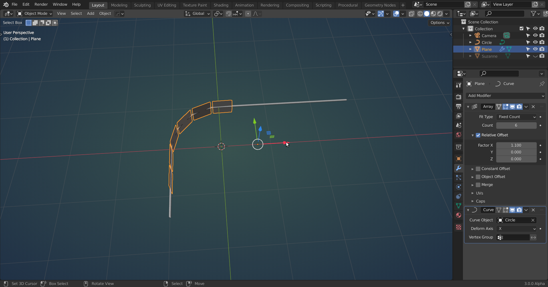 You can now move the Plane in the X-axis (or whatever Deformation Axis you are using in the Curve Modifier), but they are deforming. But that is why we use Planes; they are flat, so we can simply rotate them: