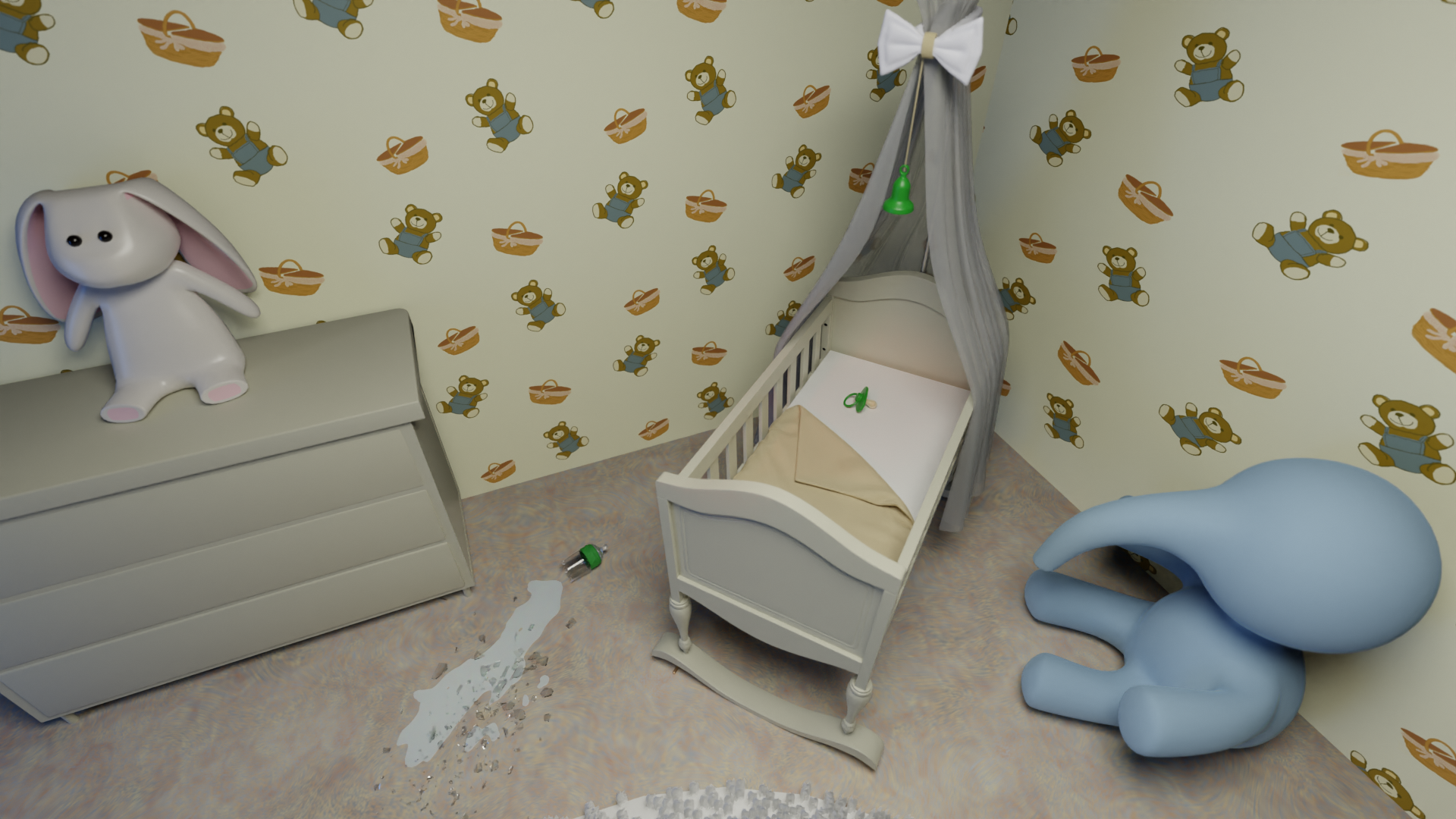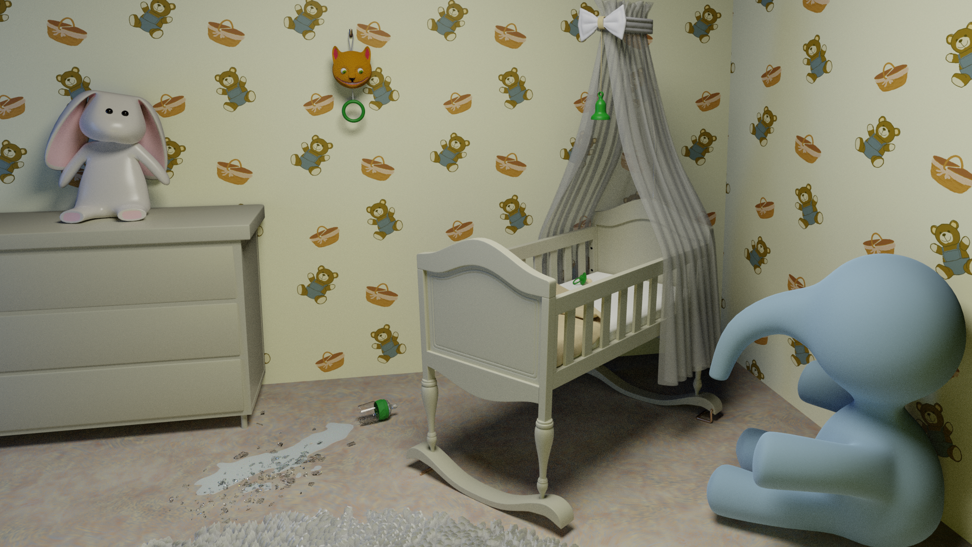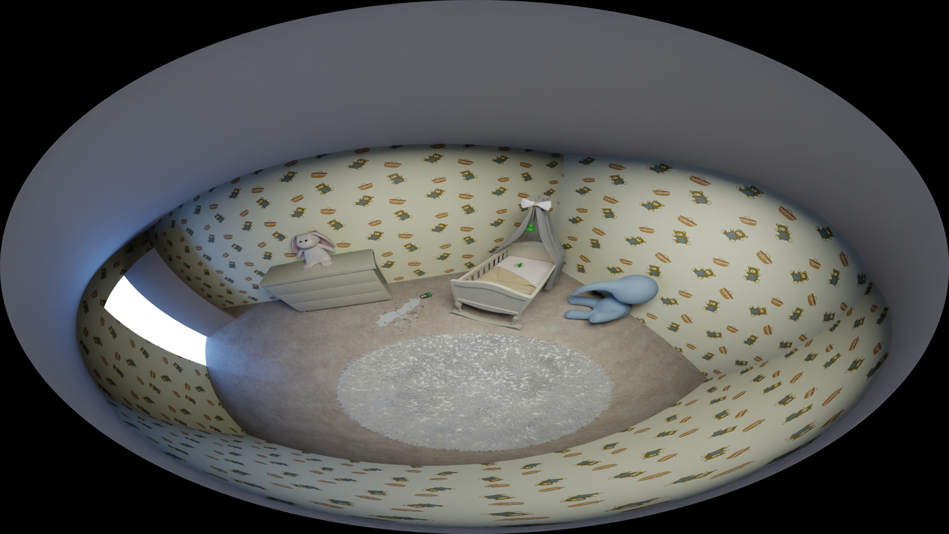 @adrian230 decided not to use the fish eye for this scene; I want this at first glance to just be a pretty baby room, that makes you happy to look at and then....the happier you start, the deeper you'll fall...