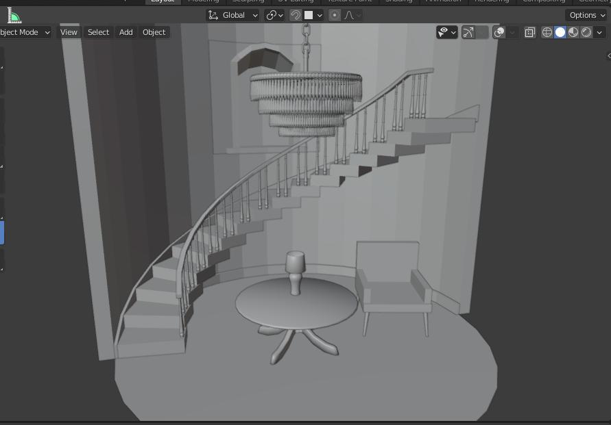 So far, I just have a simple sun lamp shining in the window, with a low kelvin value, to simulate nighttime. Not sure if that'll make it to the final render, though I'll probably have to enclose the rest of the building if I decide to switch to an hdri. Also still getting a fair amount of noise here, despite turning on denoising and cranking samples up to 128.