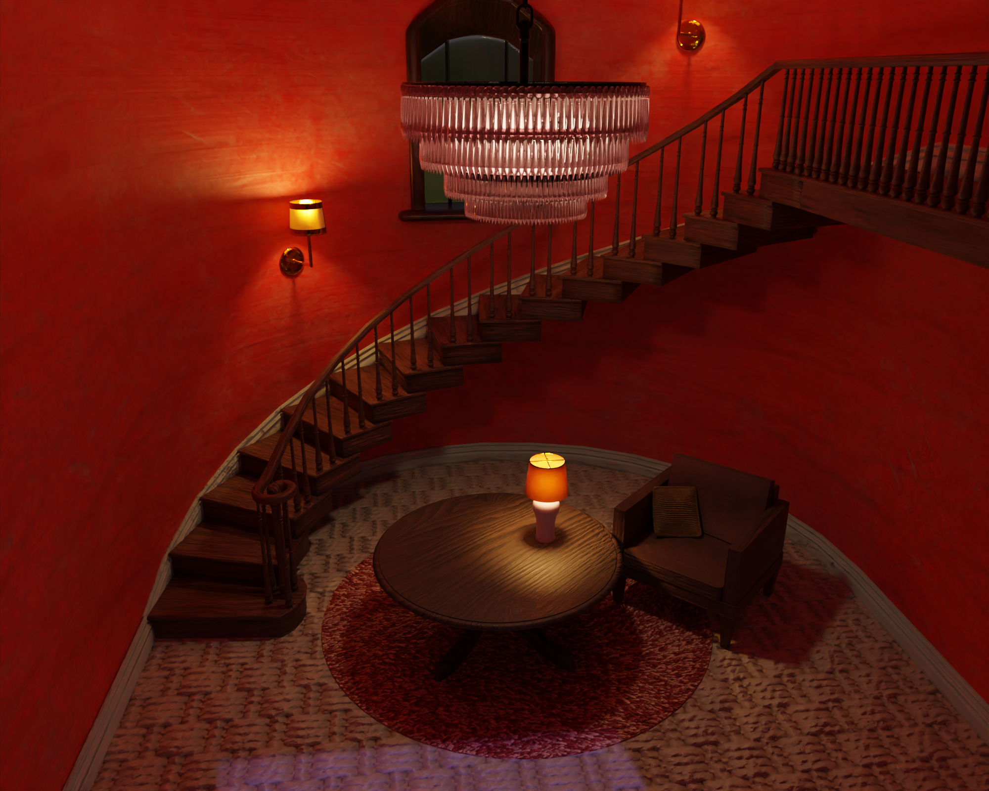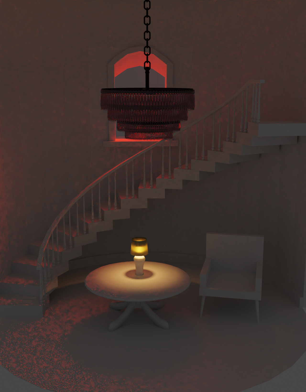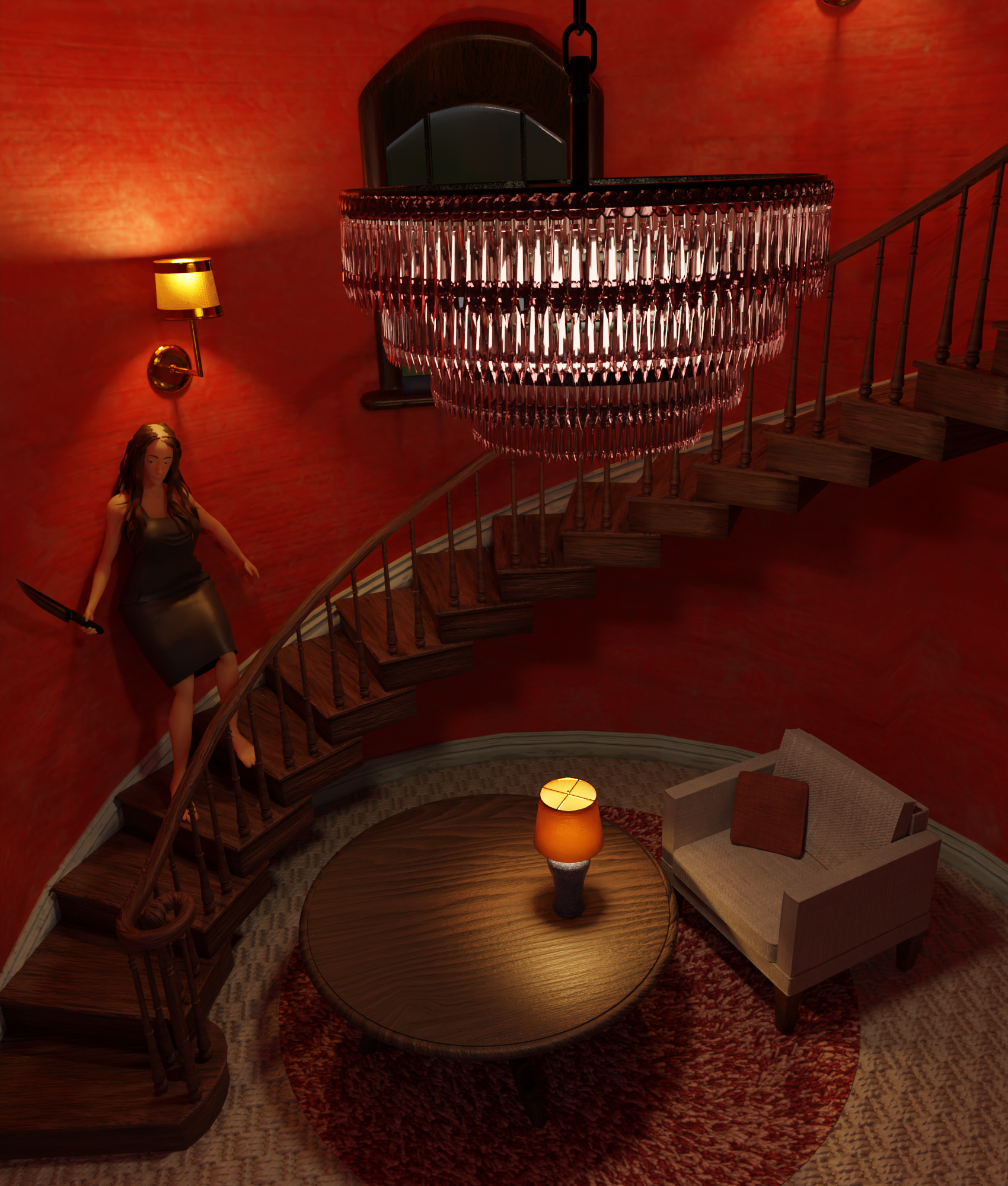 This is my final image. Didn't quite get there with a few aspects, as you can see... Didn't end up adding the shadow people as I had planned, as I had a hard time getting a shadow catcher to work in the scene, and I didn't bother doing anything with the chandelier. It's really just a lady with a knife, fearful of some sort of approaching intruder...