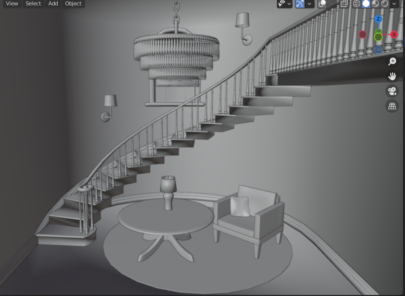 Just filling out the scene a bit more. Got caught up with a few details and had to change course on a few things, like the design of the chair, to keep the ball rolling. The room is now completely enclosed, with the exception of the window and an open door. A few more light sources have been added, with the wall lamps.