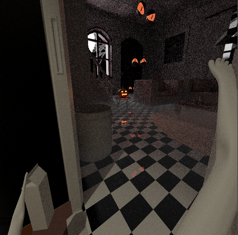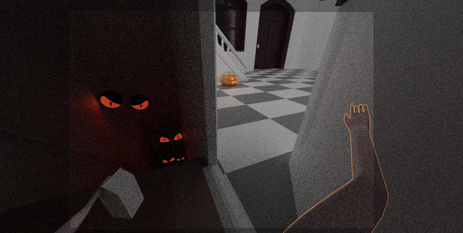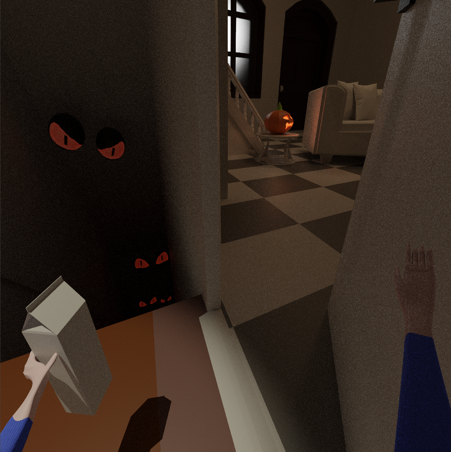 hmmm... this might be the reason why I bought a house without a basement now :). tbe floating eyes should glow, but not emit light to increase the darkness of the "pit". I'm adding some decoration to the house . THe low poly arms will be covered with blood to add some drama. I want to add speed to this still, but not sure how. The "kid" should be fleeting and I'm not sure how to do so. Maybe post proces blur, not sure. THe house lighting should also be more dramatic. the color scheme should be dark/ not saturated with the aggressive reds popping out. Maybe my character will wear glasses that are broken and with blood splatter as well. To conclude: Welcome to cliché 101 :).