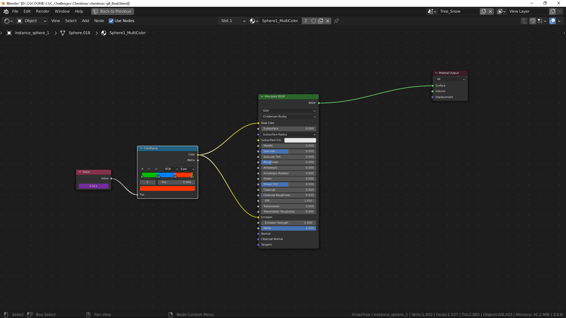 day 3 - working lights. I guess the particle system info node doesn't work with evee. and of course I want to use evee and my lights are particles. Probably should have used geometry nodes, but with my learning curve, it wouldn't have been done until next. xmas. Could change to cycles, not happening due to the time issue. So I cobbled something together that. sort of worked using. driver in a sin function, random number and. a color ramp.