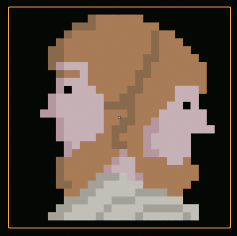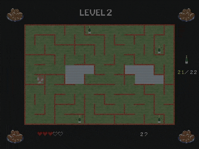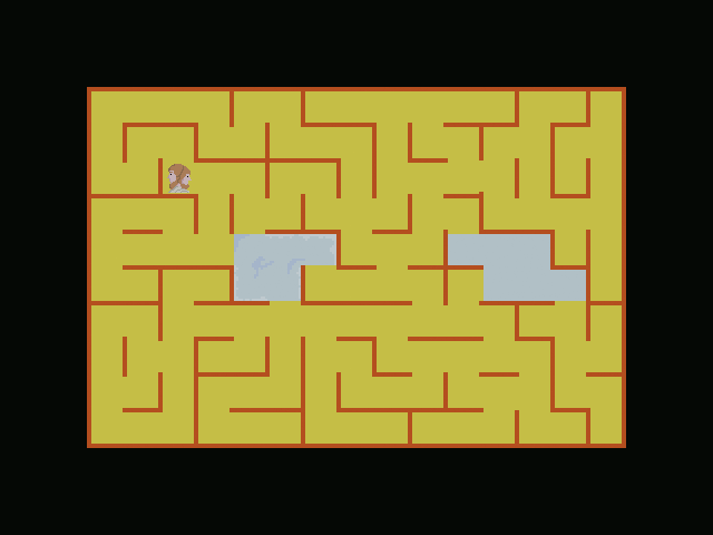 Having a more complex maze, means I have less pixels for the main character (here I used 28 x 28), and I haven't been able to fit legs in (at least not yet):