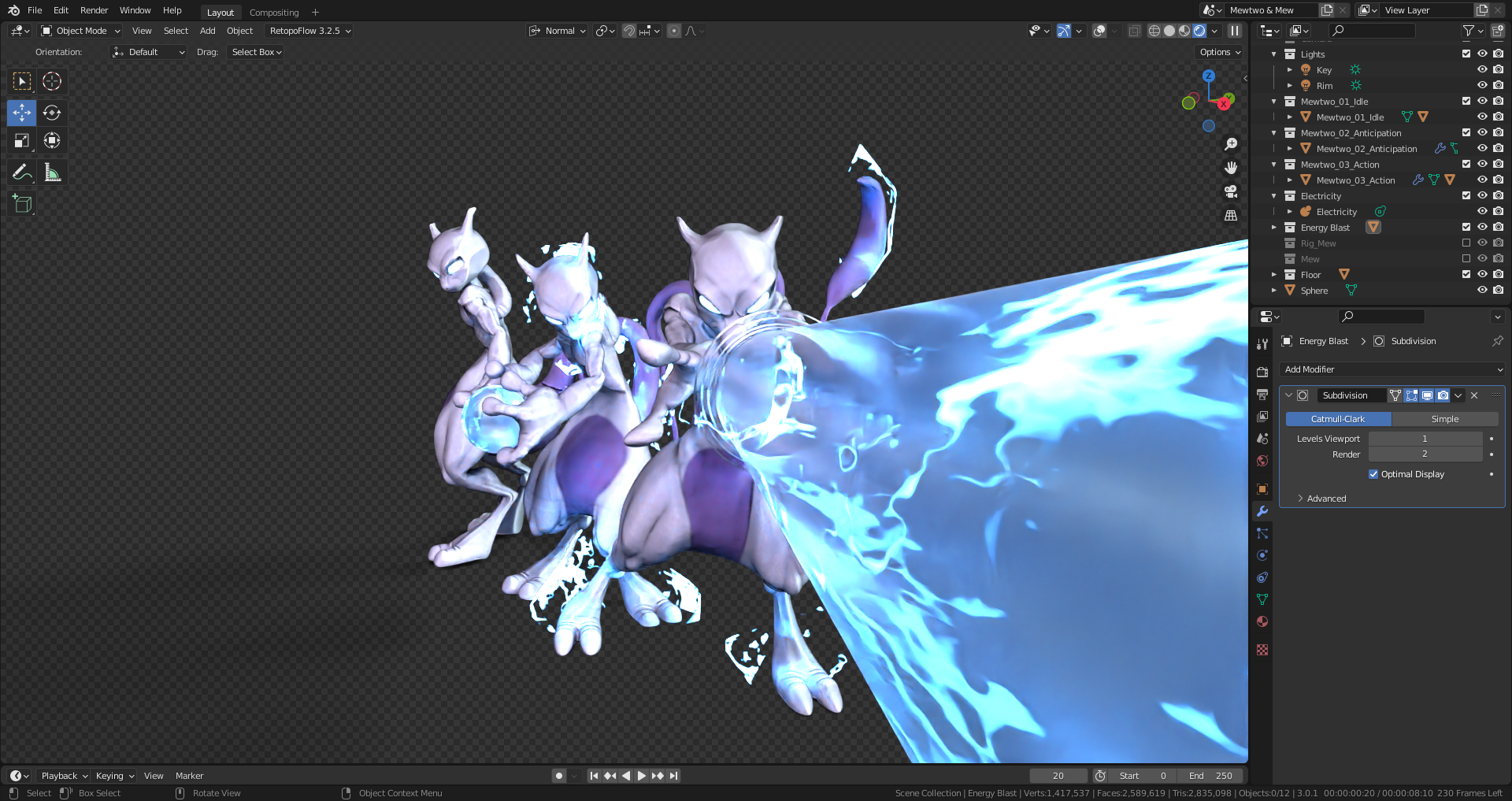 Can I give some feedback? I'm very much a beginner so if you're NOT interested then no hard feelings if you skip over my comment. It looks really cool! I love the lighting around Mewtwo and the angle where all you see is the silhouette of Mew. Is possible to change the position of the camera just a little so you get more of Mew's head and tail?