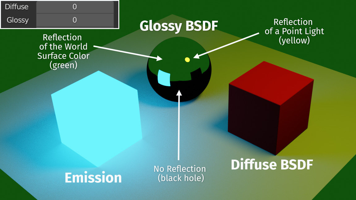 You can see that despite Glossy=0, the Emission cube, the Point light and the World Surface Color are still being reflected in the glossy sphere - because they are sources of direct light. However, the bright blue halo of the Emission cube does not reflect in the sphere, because the halo is not a direct source of light. The Diffuse cube and the plane also do not reflect in the sphere; a black hole is reflected instead of them.