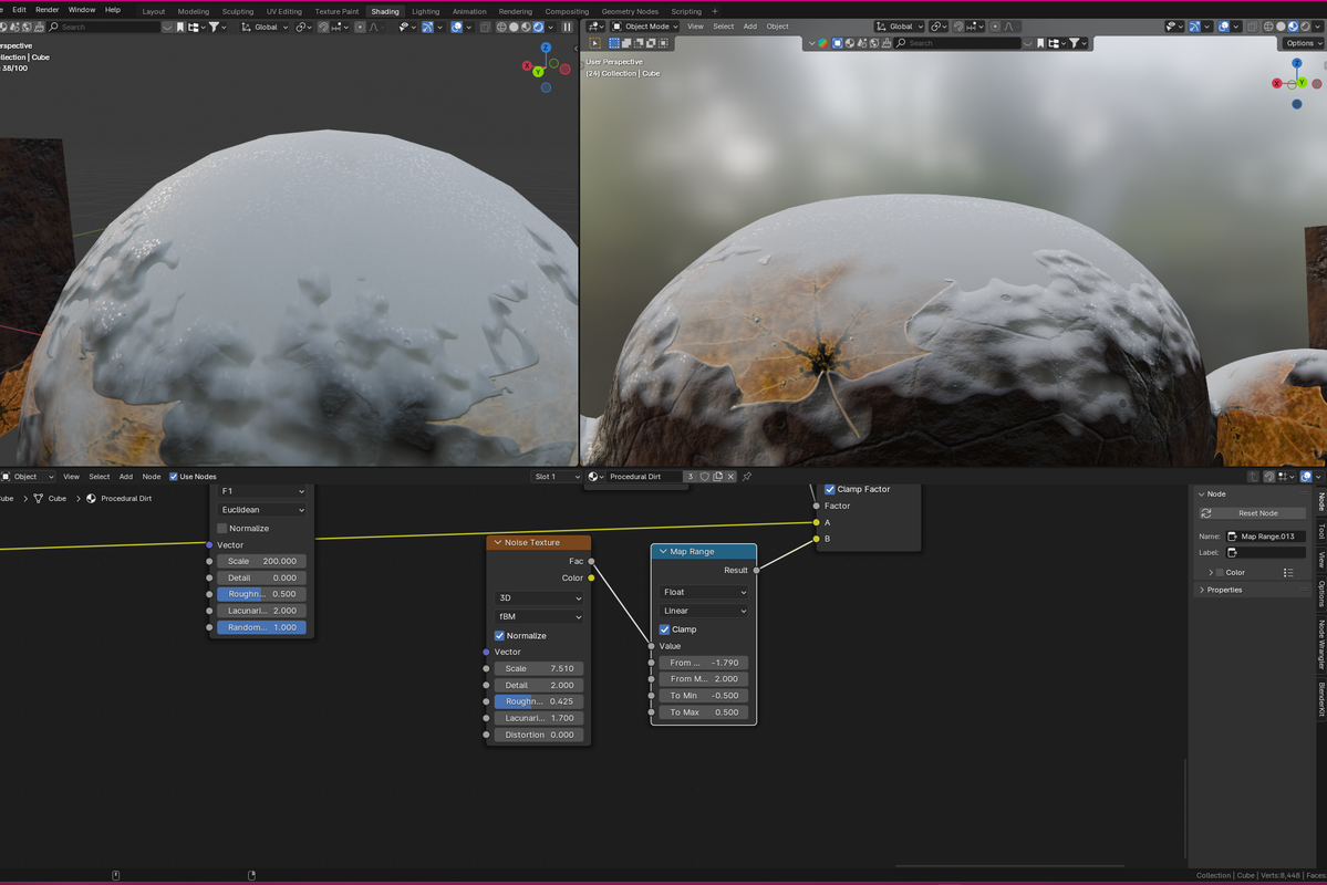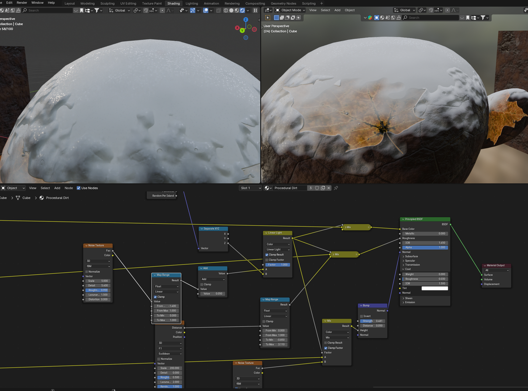 I also tried adding a map range right after the noise texture for the snow placement and nothing it seems like the bumps for the textures are not so compatible together so I tried with a map range for the noise texture bump and it seems a little better, but they won't mix.