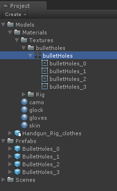 The scene "L2_Start" has the bullet holes already sliced up into 4 individual files. There's also prefabs for each of the bullet holes to be used.