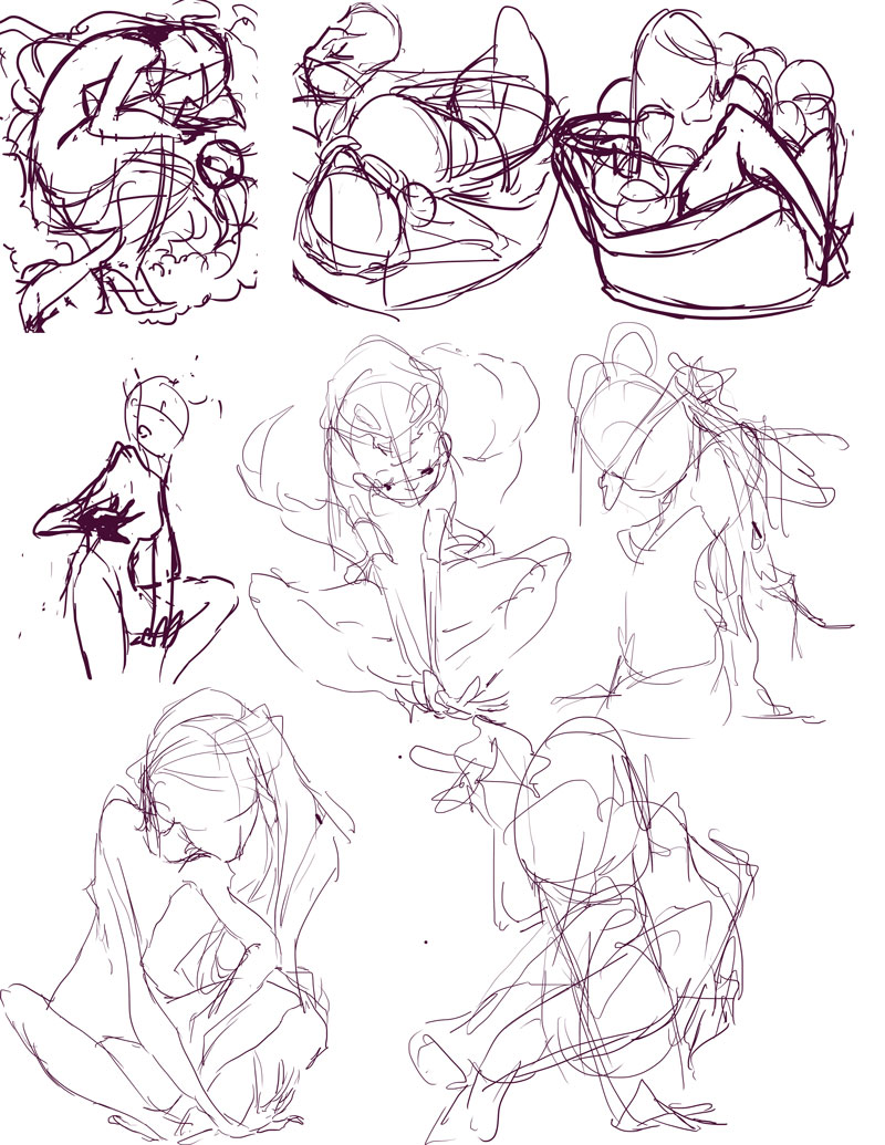 I don't know what kind of character design I want just yet, so I'm just procrastinating with some scribble thumb dumps. Maybe I'll find a bit of personality from poses instead, haha.