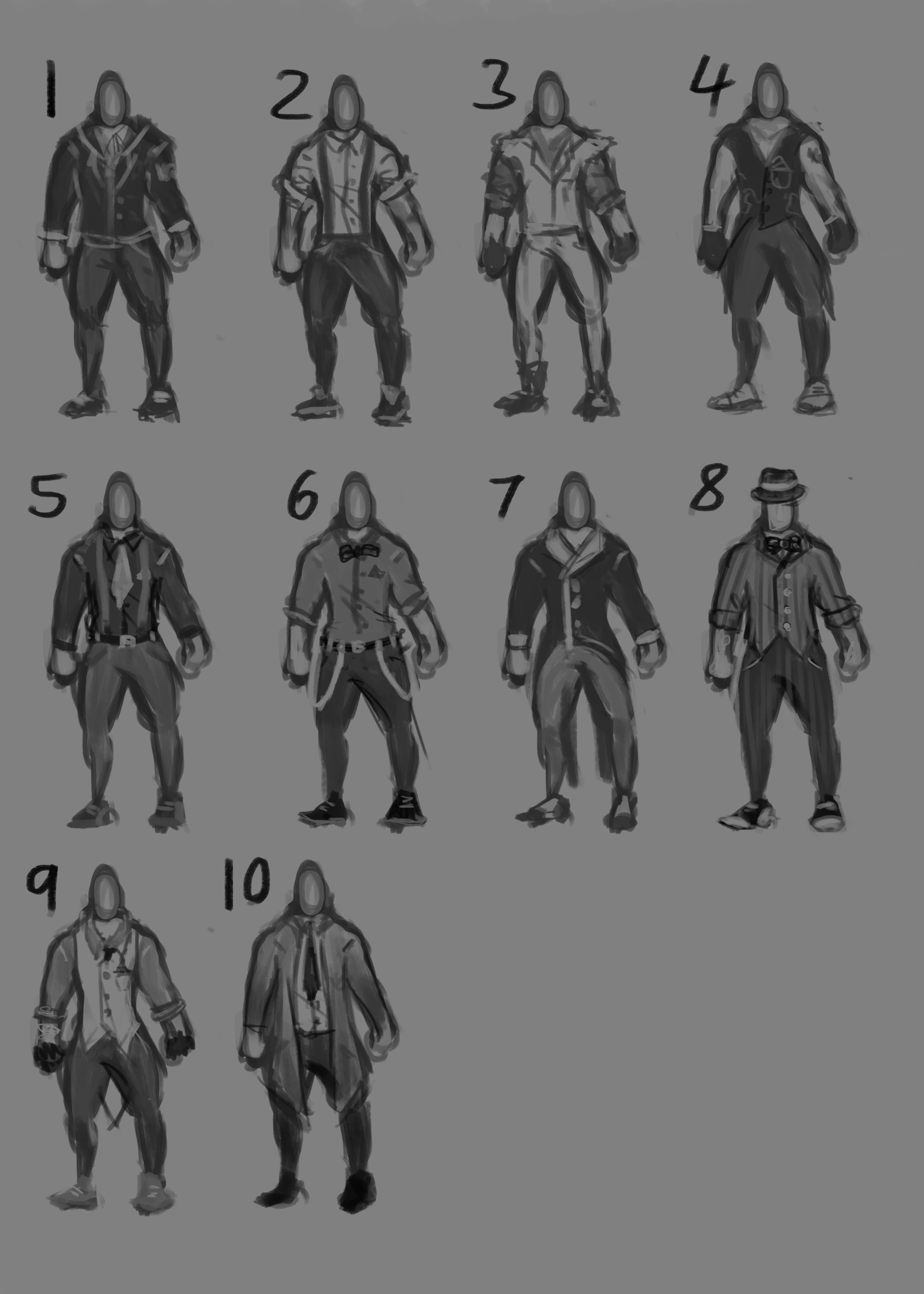 Just did some thumbnails for the contest, I'd love to know which are everyone's favorites. I'm going to design the masks and weapons then work out the composition afterwards. Really excited to see everyone's entries!