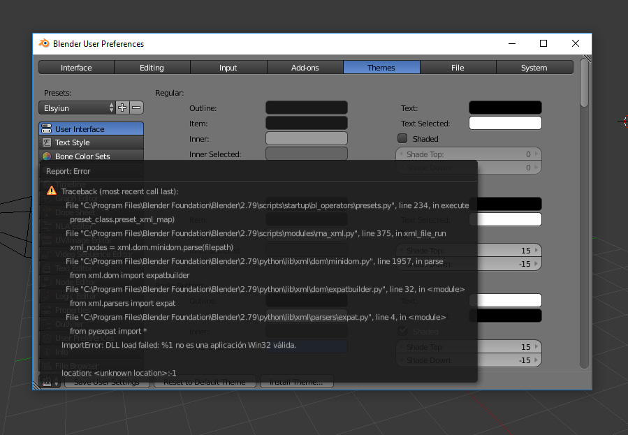 Hello everybody, I use to work with Elysium theme in 2.78 version, when I have installed 2.79 version, Blender starts with default theme and when I try to switch to any other Blender theme I'm getting this message error .
