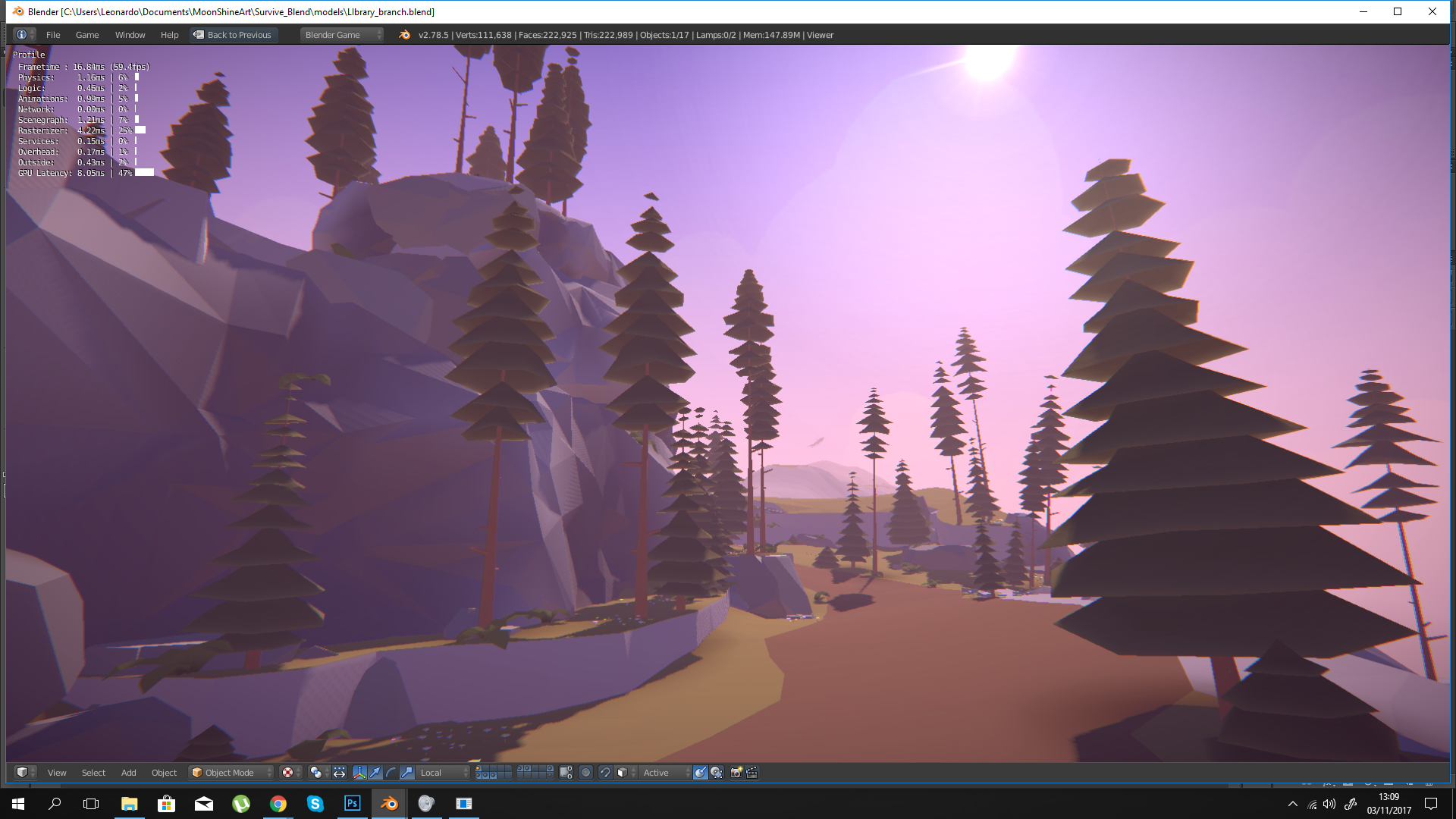 FPS still on 60 but already trying to drop. Most of it, it“s because of the base mesh terrain containg more than 200 000 polygons and blender also don“t deal very well with polygons like it should be. Optimization (LOD) of the base mesh terrain will come at last, but not yet.