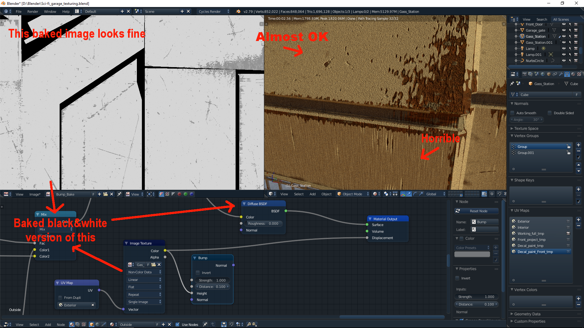 So I'm trying to get better at making game assets, and I'm at the texturing part now. All the UV's and everything is generated, except for the ones I'm baking to. But when I plug this generated texture into either bump>normal or right into the displacement it gets stretched and distorted as if the UV's are off. Texture looks fine in the regular output, so I tried baking it, opening it up as an image texture (which also looks fine with no stretching), but it still gets the same streched effect when using it as a heightmap, it makes no sense to me. I even tried deleting my other UV maps so I was only left with the one that uses this texture and nothing changed. Hopefully someone here with more experience has a clue what's going on and could help me get back on track. Here is an image to help explain.