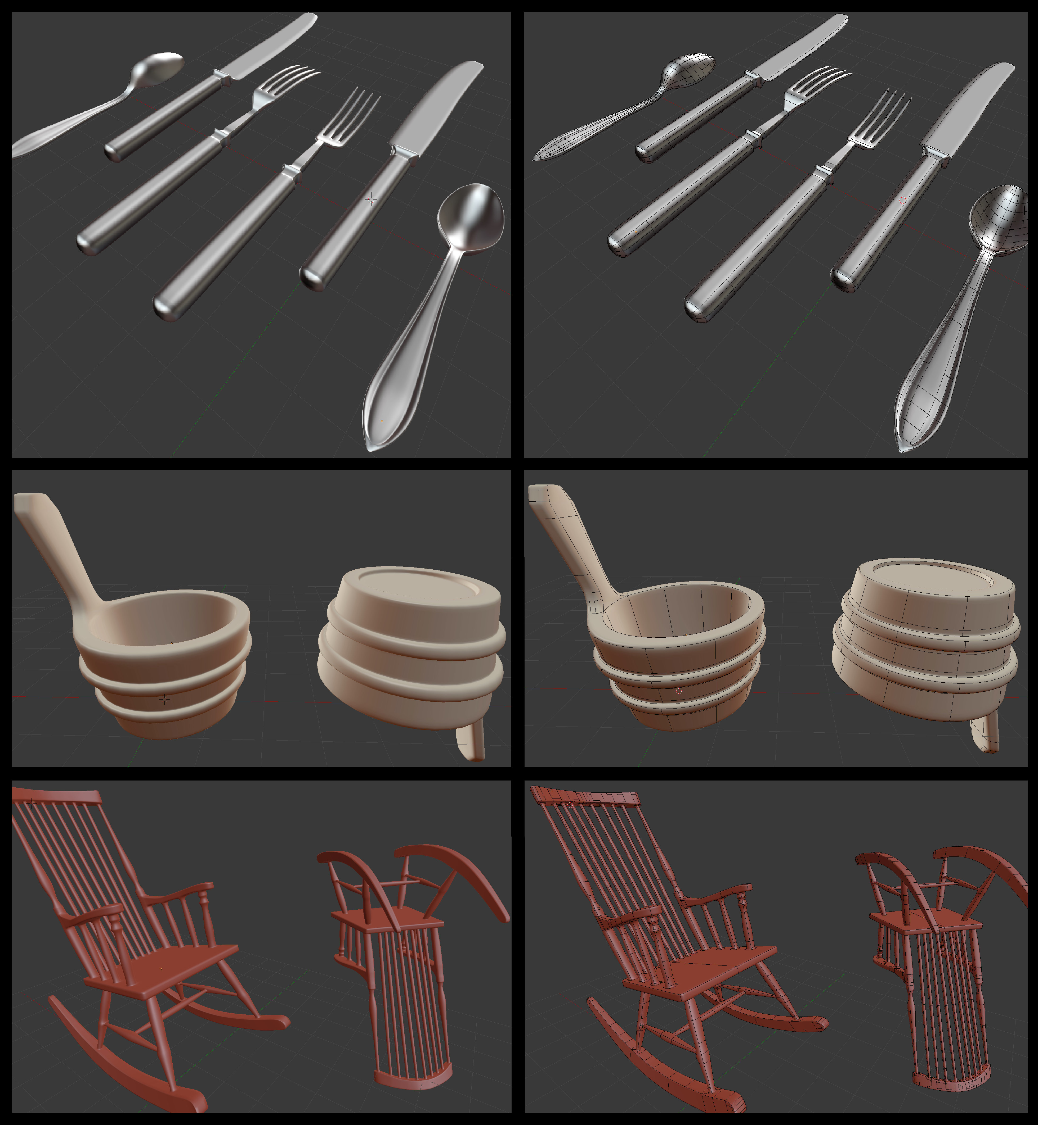 Great job on all three of these! I can't quite place what, but something feels slightly off on the fork and spoon. Probably has to do with the curvatures.