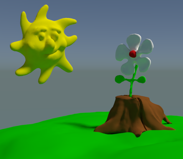 HOMEWORK: Create a scene out of primitive shapes. It can be anything from a landscape to a spaceship to a character. Just get comfortable with creating and positioning mesh objects. Here's an example: