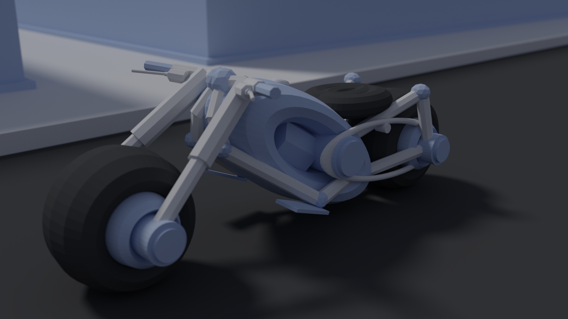 Hey Kaj, I love the motorcycle design, fun use of the primitive forms. Your landscape is really detailed. It took me a little while to find the town in the background. I wonder what else is hidden in there. The town is following the rule of thirds and the nebulous clouds point my eye there. Unfortunately the dark blurry shadows in the foreground compete for the attention of my eye. If the render camera was elevated and angled down a little, perhaps the blurry trees and shadows would be more subtle. I love the color variations in the trees and ground which gives them a warm and earthy look. Great work!
