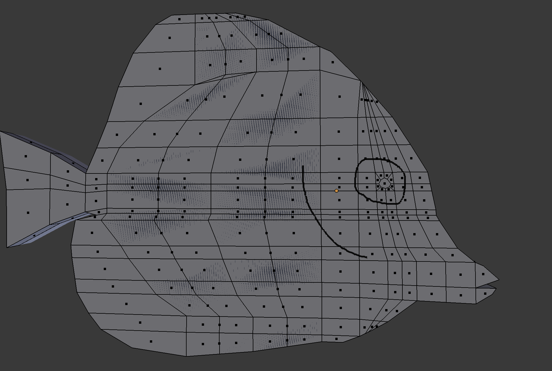 For the gill... we need to talk about "edge flow." You will want to redesign this part of the fish so that edges and faces fit that curve you drew with the grease pencil. It will feel like you are creating your own "Dot to dot" activity in 3D.