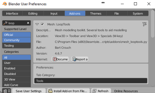 Secondly, you don't have LoopTools enabled, which is causing the other error. LoopTools is an add-on that comes with Blender, and I am so used to having it available that I completely forgot it is not enabled by default. I will change the add-on to warn the user that LoopTools is not enabled, however, for now, you can simply enable it manually in the usual way: