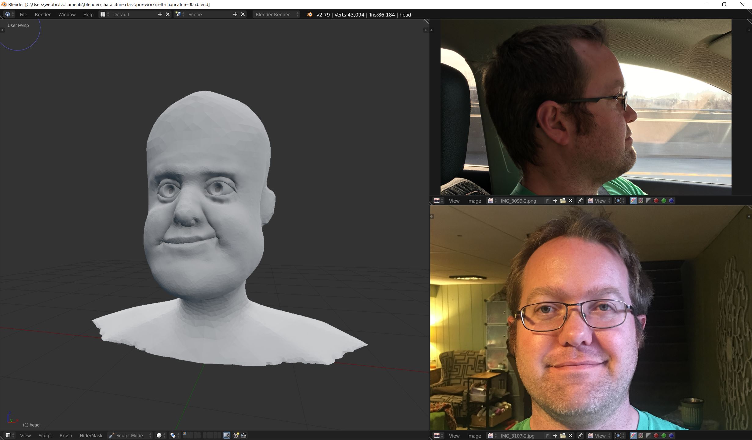 CLASS ANNOUNCEMENT #4 (Mar 26, 2018): Week 3, done! Thanks to everyone who submitted by Sunday. I'm quite impressed by the neutralization and retoplogy work I've seen. It's a lot of work and I can see that effort in the WIPs and especially completed submissions.