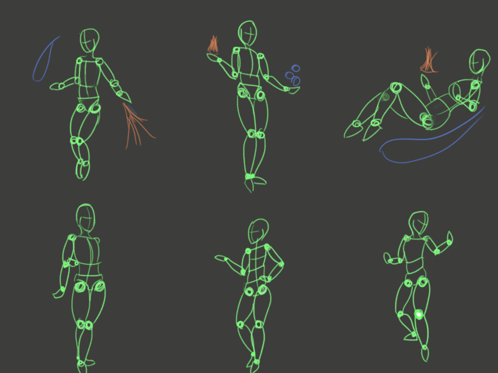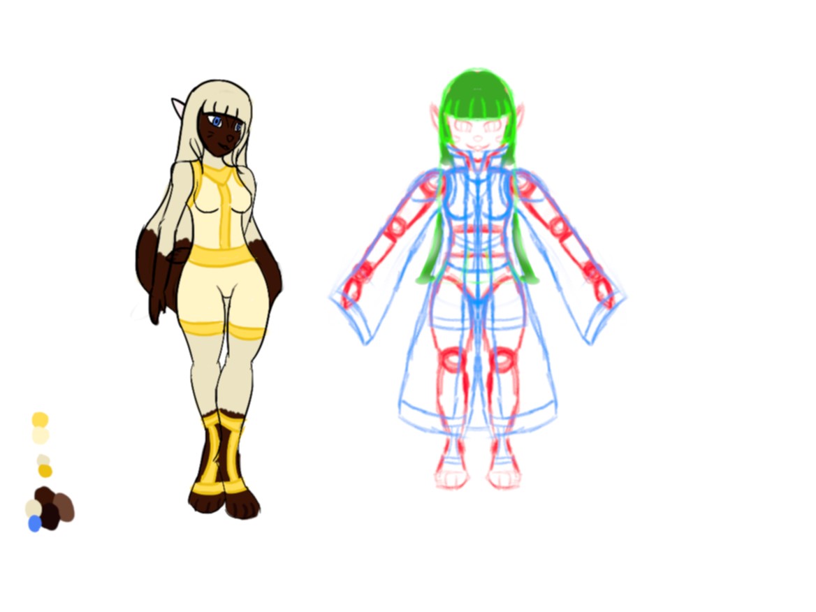 As you may notice, things got messy. First the pose didn't feel representative of her personality to me, so I decided to look for a new one. I started drawing blocks until they looked like something humanoid: