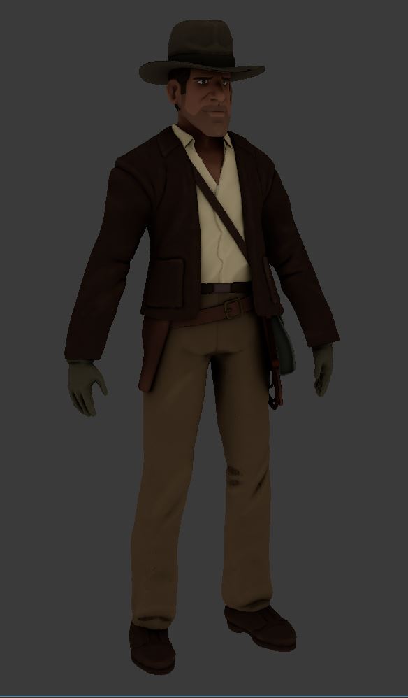 After texturing the character, I modeled his typical equipment and textured it as well. And this is where I ran into a problem. Indy's jacket is supposed to drape over the items around his waist, but I failed to account for that when I sculpted and retopologized the jacket. Because of the shrinkwrap modifier I couldn't edit either object without severely distorting the shrinkwrapped mesh. It took a little while, but the way I worked it out was by blocking in a very simple mesh to surround the jacket, and then used it like a lattice, giving the original sculpt and retopo'd jacket a mesh-deform modifier and binding both of them to it. In that way I was able to edit both objects at the same time by editing the lattice. I'm glad I learned this utility, but it might have ultimately had little point, since at the very end of everything I ended up applying all the modifiers, decimating the mesh, and deleting all the sculpts anyway.