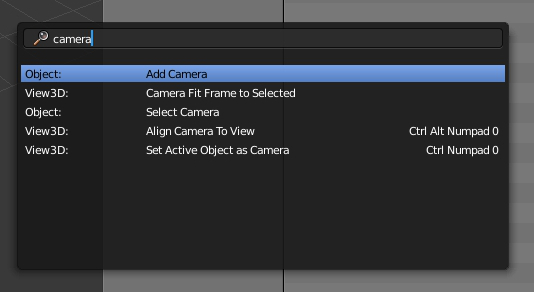 2. Inside Blender - Spacebar menu - enter searchword: camera