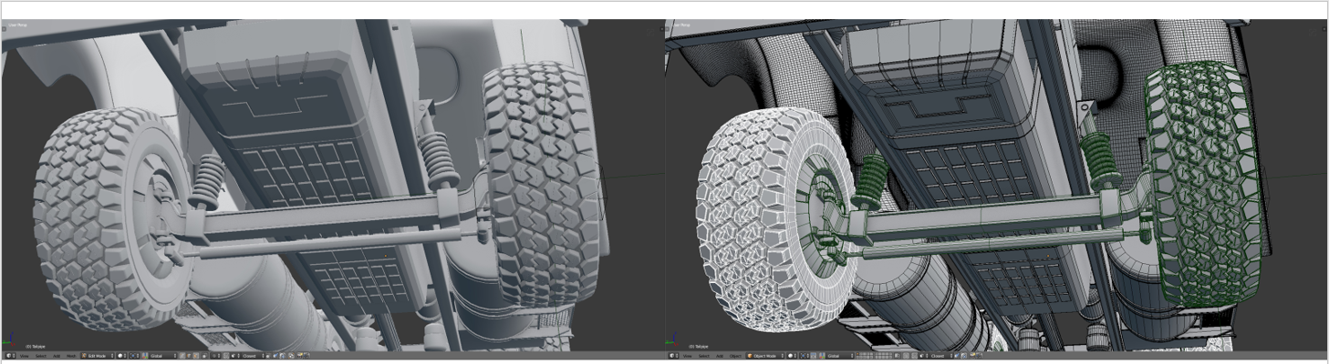 Here's some picture with/without mesh of the whole vehicle, the rear transmission gear and the front one: