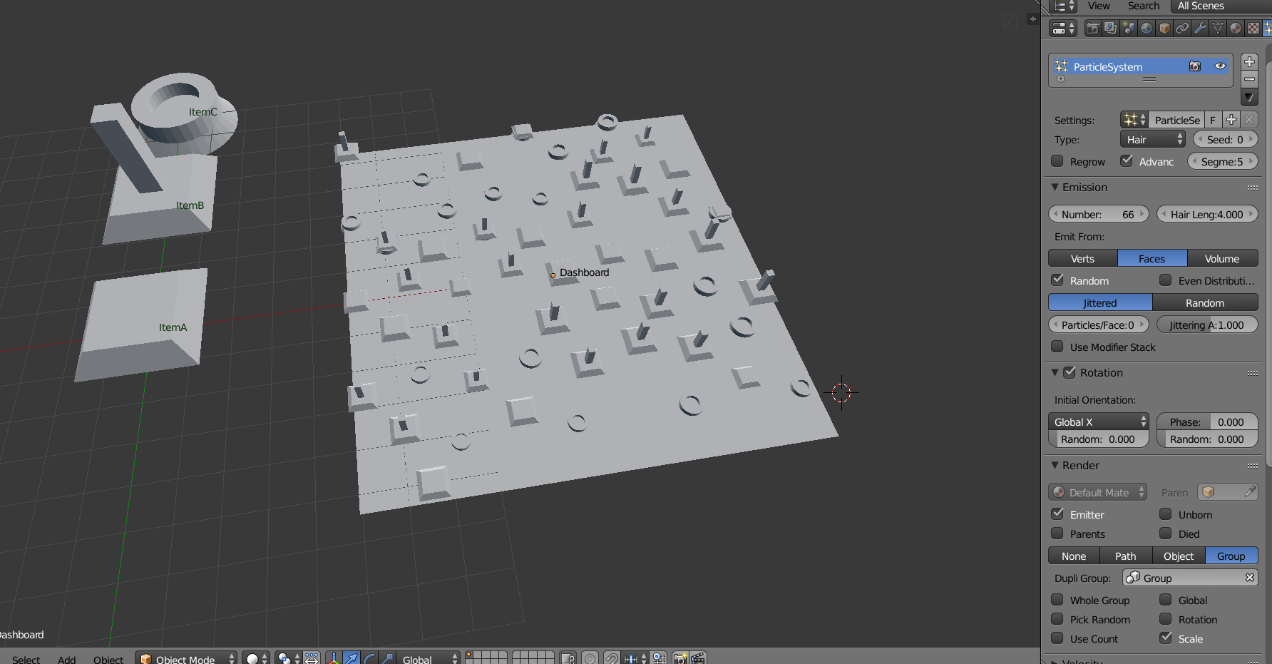 You first have to model some buttons,switch, gauge and so on (namely ItemA,B and C on the image above) and create a Group (ctrl+G) in which they all belong. Then on your dashboard (here I used a plane that I subdivided with W so I can get mort verts) you create a Hair particle system. Don't forget to activate "Advanced" so you get access to the rotation sub-menu. Use the Group render mode and adjust the rotation as needed (in my case, Global X, depends on your object orientation).