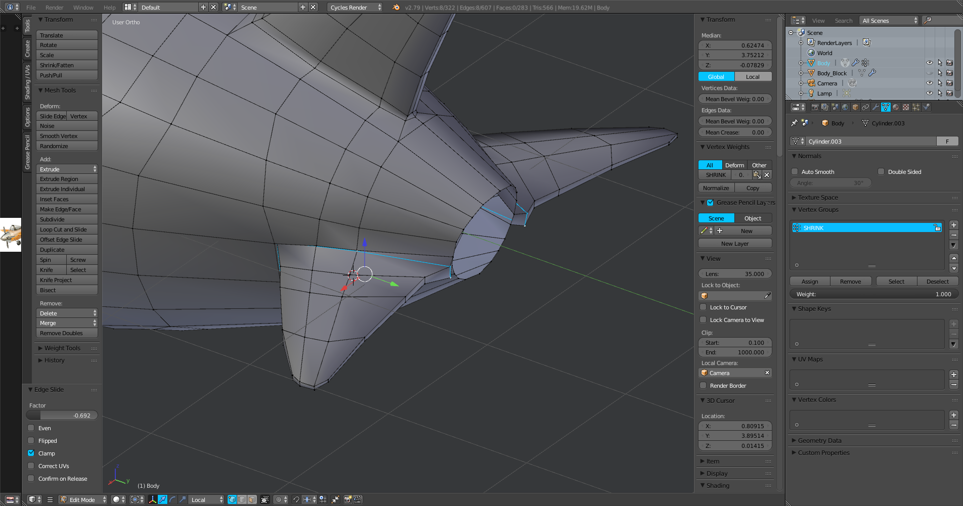 I started having this issue and I am mostly curious as if this was normal as the shrink wrap is not exactly perfect. As I was doing the Hard Surface modeling exercise and when I got to the lower tail fin, the end point seemed to be going out too far back when I removed it from the vertex group. This then caused this unpleasant looking lump to appear as I felt It was not conforming properly to the mesh scaling also The edge slide was acting weird as well just as the scaling.