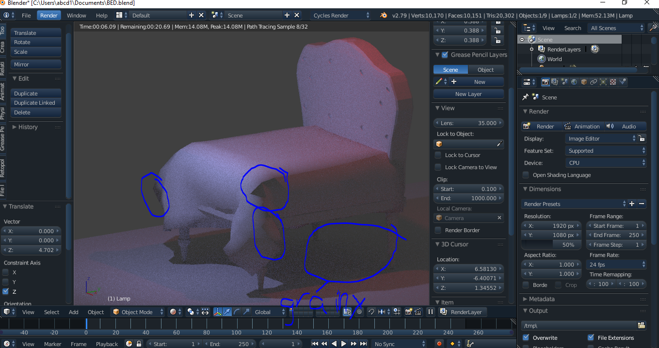 Regardless,  I tried to set up this "One render/mesh a day" thing for myself where I make a mesh/render of something every day, and document what i've learned, what I don't know, what I don't know I don't know, and what to generally improve on. Today, I made a  bed.  I just put a few lights in cycles to render it. I wanted to push this further, but I didn't know how. I wanted to add felt and textures to the blankets, I wanted to give more detail to the bedframe. I circled some of the problem areas in blue. I also wanted to make it less grainy. I also wanted to use radeonprorender, but I wasn't sure how to do that when it runs very very slow for my laptop. What could I do to make it more bareable?