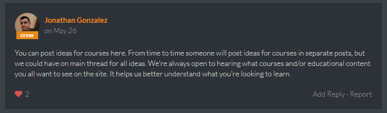 Wouldn't it be an idea to open a pinned thread in which users could suggest things/ topics they would like to learn more about? There propably would be a huge variety of ideas and a course takes some time but it might be helpful for instructors to see if a large amount of users want to learn more about a specific topic. I for example would love to learn more about creating game assets (similar to the weapon course) or how to build an atual scene full of assets. Also a course on how to create an interior visualization and use textures and lighting to make it look as photorealistic as possible (similar to the architectual visualization course) would be awesome.