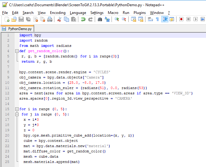 The code is much more readable/beautiful like that, then you can save your file with .py extension and in Blender you can open such ready codes in Text Editor window, let me show it analogically with the original 25 cubes demo: