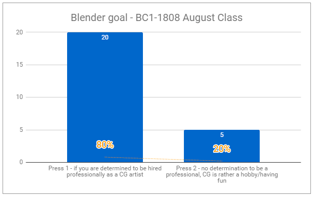 Also there was an interesting question at 1:03 about the goals with Blender, whether being determined to be a professional, so just thought on this empty day would summarize the results of that :D (if someone added a some kind of middle answer but mentioned 1, then it was counted as 1, also added a 2 from my side as I am learning Blender from love)