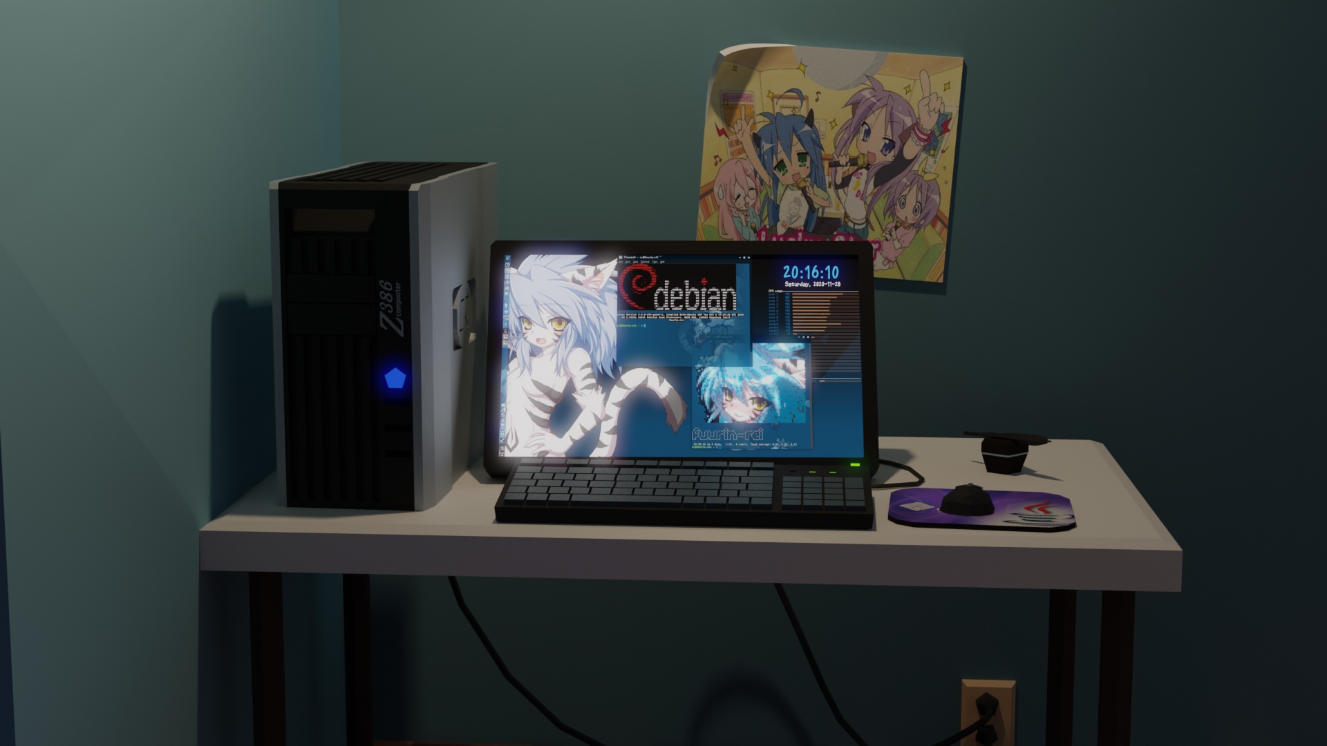 I started doing the lowpoly rocket tutorial, but ended up going somewhere else artistically (I kept to the five-sided prisms, though).