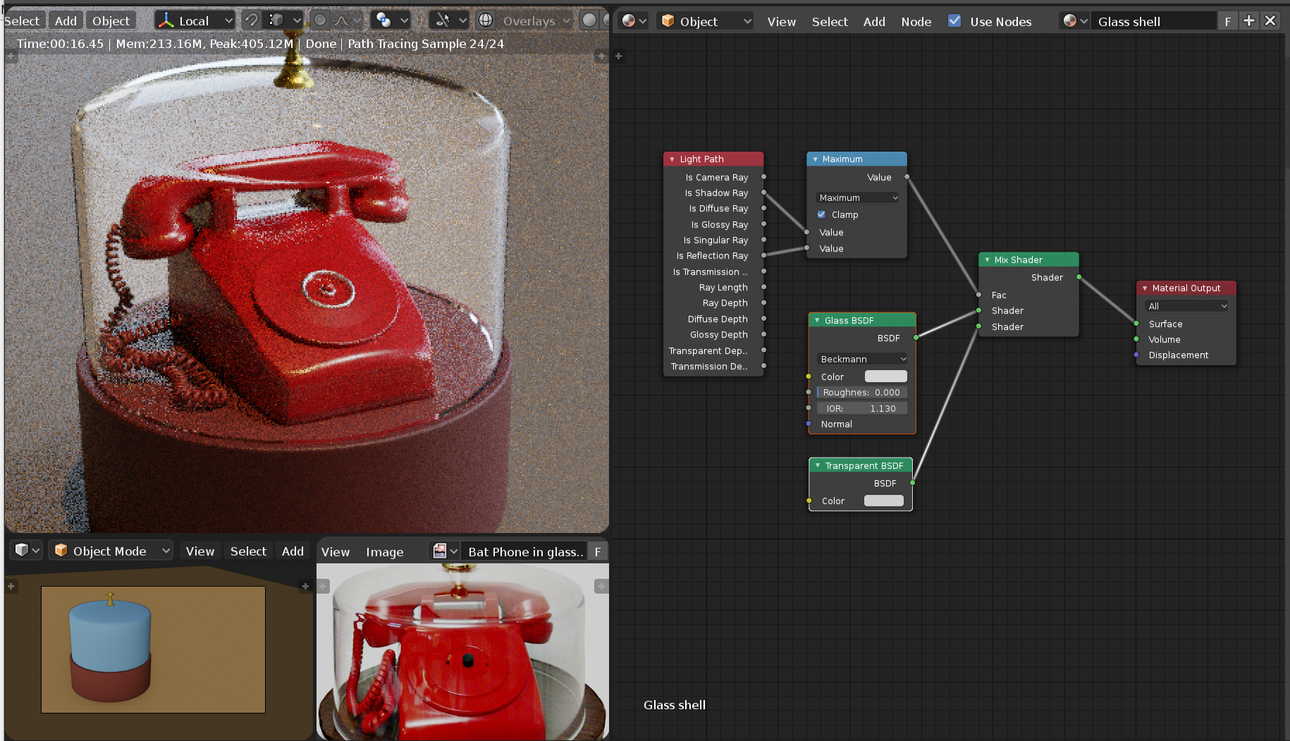 I forgot to mention last night: The scene is rendered in Cycles (as you probably have seen). I want to render the final images in Cycles, as well as Eevee. To me it still looks better in Cycles. Especially the glass I find hard to achieve in Eevee. If I just used a Glass BSDF node, the phone under the glass is very dark, 'cause it seems the glass doesn't pass the glass properly. I found the following node setup for that issue on google (I think it's still kind off wrong., still figuring out what to do with it):