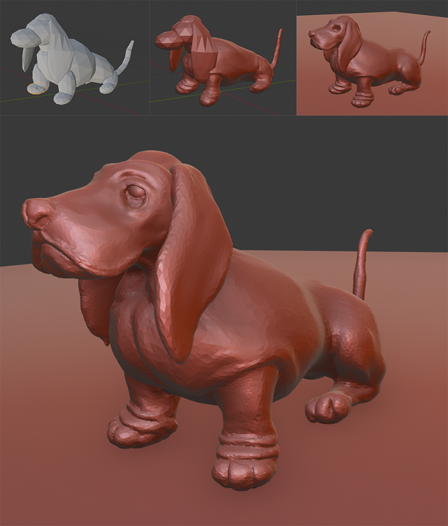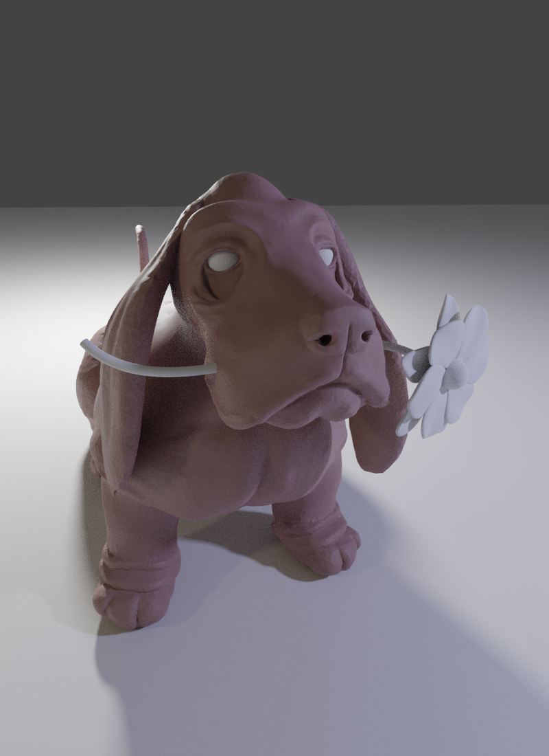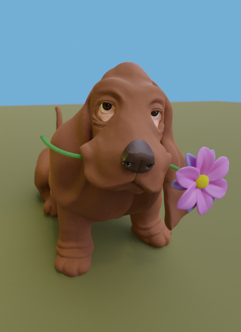 Here's a WIP of my Final Project. I was very unsure of what to do until I saw this image of a dog bringing a flower. I like cute pictures, so I decided to do this one. I started of with a collection of primitives to build the shape (in 2.8). I then booled the major part together in blender 2.79b (body, 4 legs, head, tail). - I noticed you cant copy and past between 2.79 and 2.8 anymore, so I appended the objects to 2.79 and back.