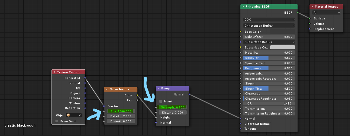 Just a Texture Coordinate node as the vector for a Noise texture (Generated works just fine, there's no need to UV unwrap for adding grain unless you really really want to). The Noise texture's Color is plugged into the Height of a Bump node, and the Normal of the Bump plugs into the Normal of the Principled BSDF. And that's all there is to it. The Scale of the noise texture controls the size of the grain, while the Strength value of the Bump node controls how high the grain stands up off the surface of the plastic. So play with those two values to achieve the effect you want.
