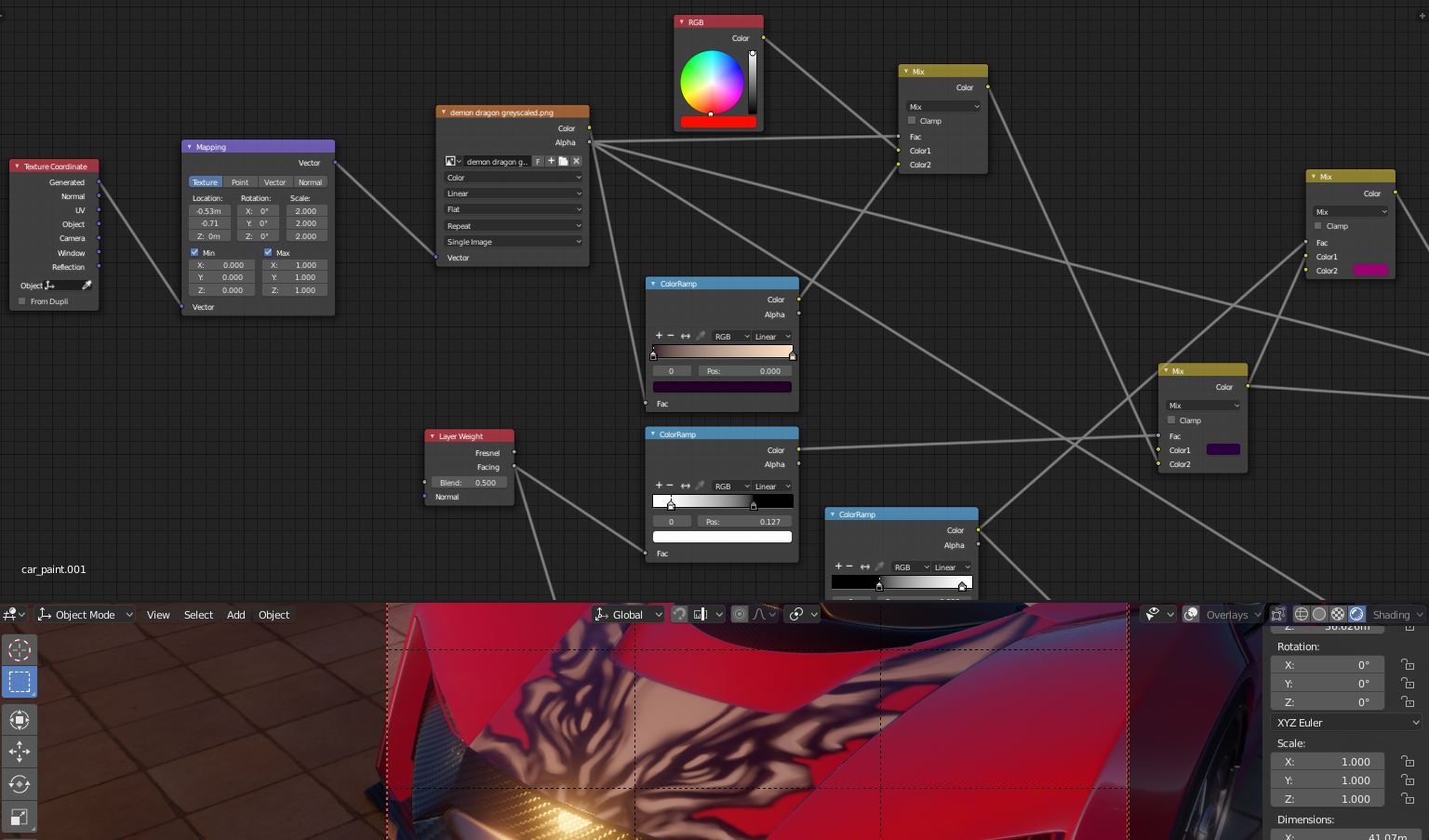 @theluthier Thanks I m very happy how the car came out, I got to experiment a lot of stuff with eevee and think this node arrangement to add the aditional art should work well on most procedural materials.