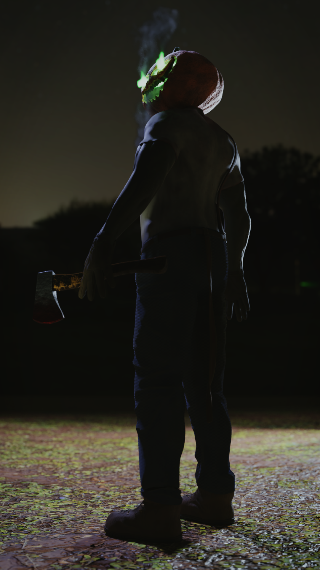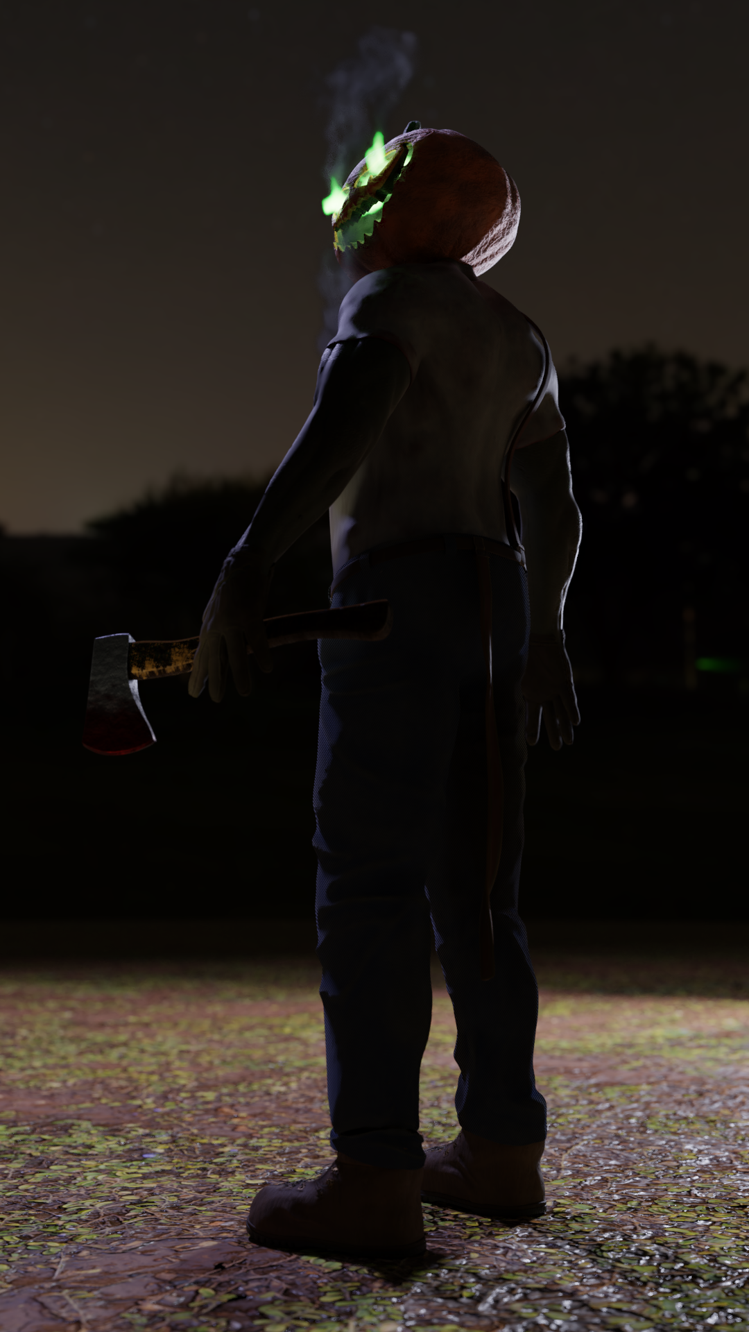 Well this is what I have for the character render. So much more I wanted to get done, like the posing, the materials not looking right, the lack of small details, the lack of wrinkles in the shirt, the lack of detailed skin, lack of an interesting background etc etc. I'm just fortunate that this is part of the competition which, if I'm allowed to continue taking part in, I can iterate on it. I'll write the story dialogue thing I do when it's fully done. Lighting, fire and pumpkin look alright for the most part though, I think.