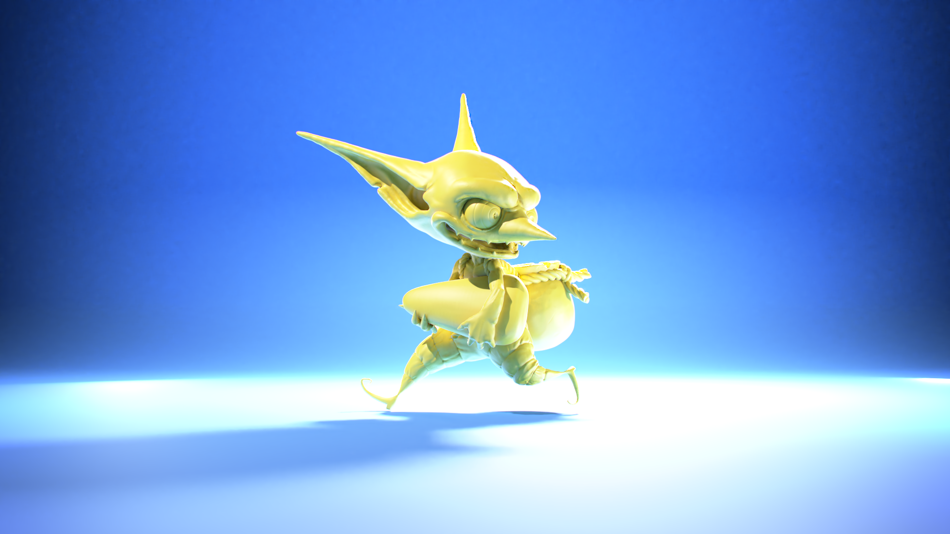 Don't think I did too bad, though it could be a bit more contrasted. Also for the LIFE of me I couldn't figure out how he got such a strong rim light yet has very little shadow. The closest I got was putting an area lamp almost directly above our little goblin friend here but that'd end up making the entire thing bright. Also, fun fact, this is using SRGB, 'cause Filmic honestly looked kinda horrible. Guess I'll be sticking to SRGB if I wanna do stylized stuff from now on.