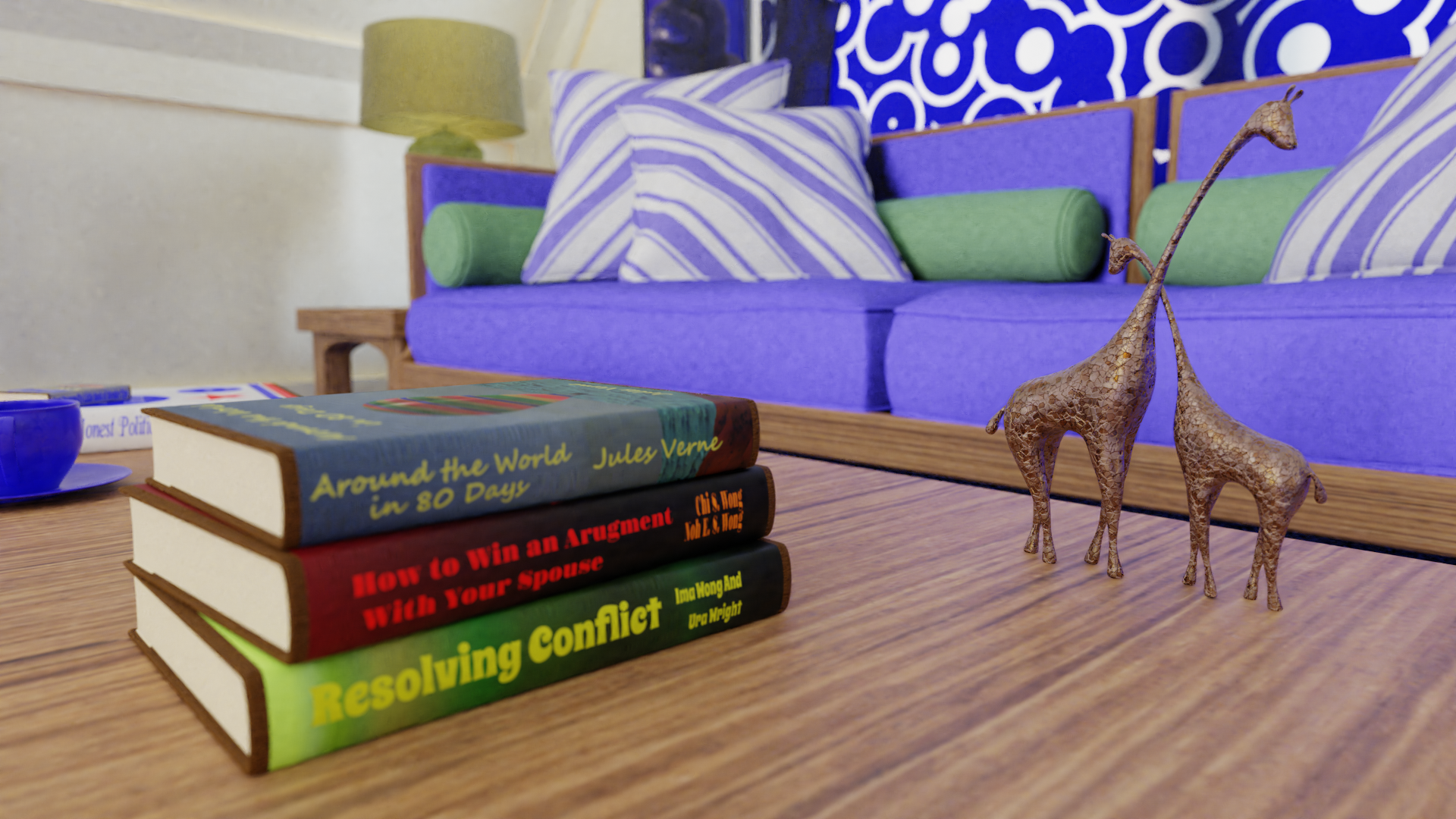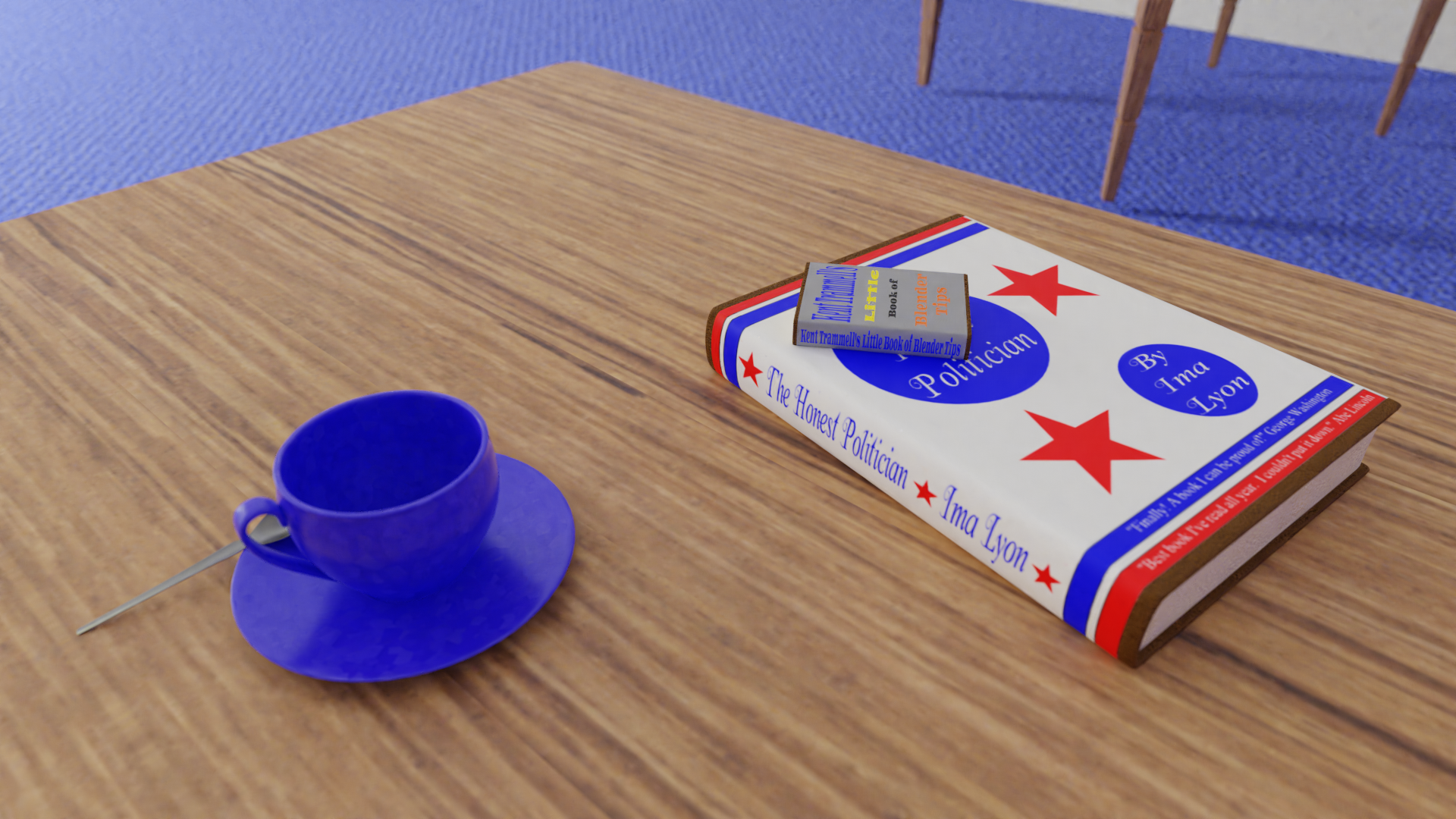 The book titles...if you can't read them.. Around the World in 80 Days by Jules Verne, Kent Trammell's Little Book of Blender Secrets, The Honest Politician by Ima Lyon, How to Win an Argument With Your Spouse by Chi S. Wong and Noh E. S. Wong, and Resolving Conflict by Ima Wong and Ura Wright.