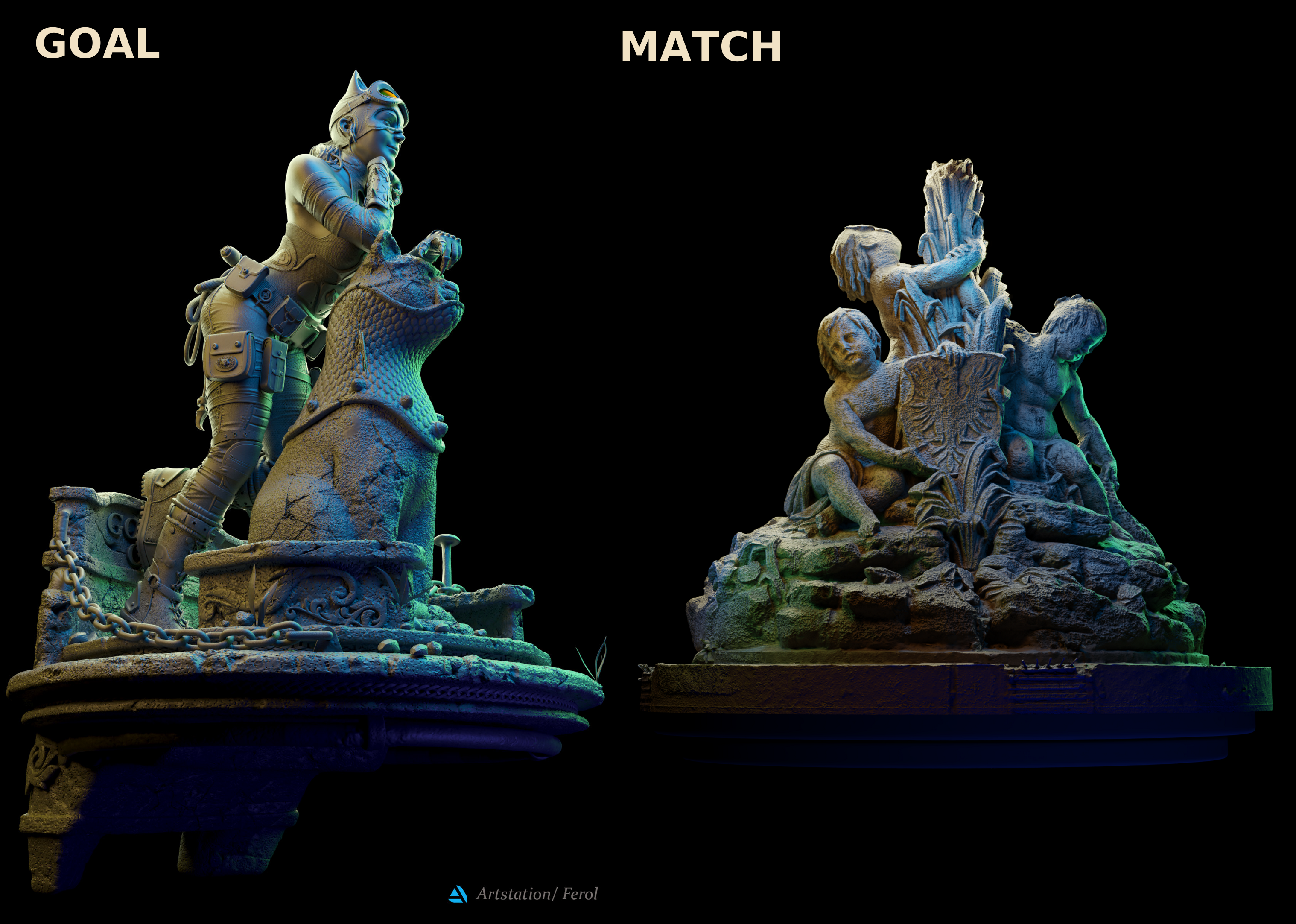 The goal image is "Catwoman Statue" by Fernando Olivera, the sculpture is actually a 3D scan of a fountain right from the city I currently live in (when I found it on Sketchfab I just knew I had to use it).
