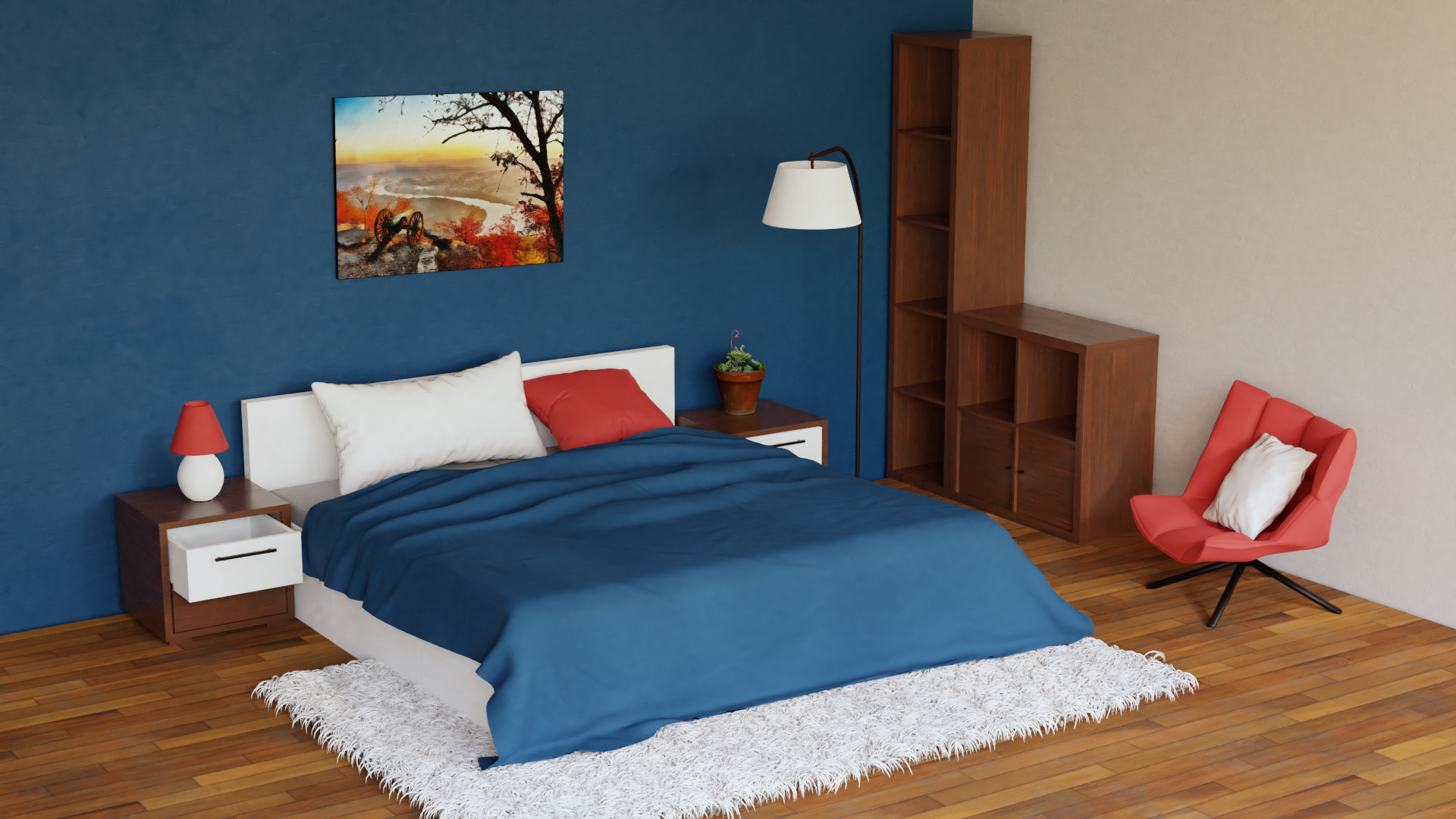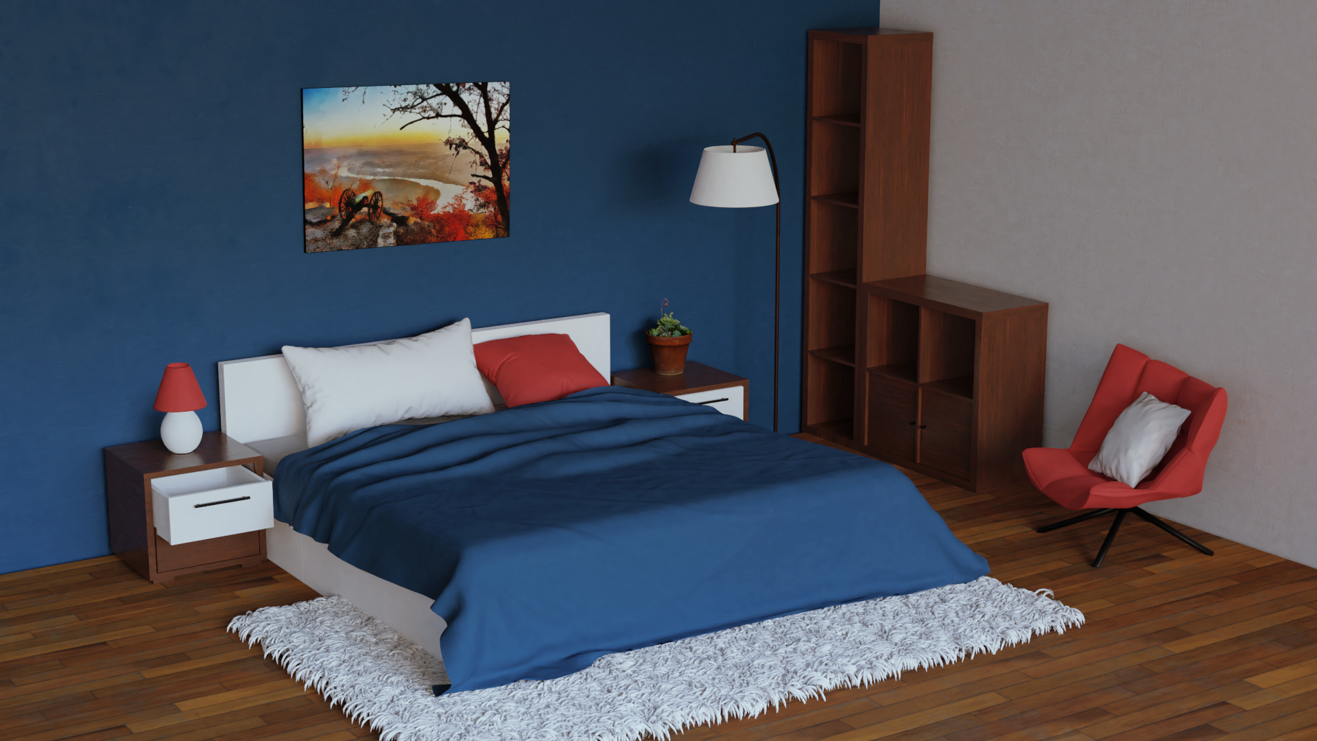 My rambling aside, this is the scene I downloaded from Sketchfab. I was going for a minimalist colour-blocking style that I keep seeing (read: I know zip about interior design). I had to edit the room somewhat (things were sinking into the floor, the window was awkwardly placed...) and I created the carpet hair because the original scene uses a texture. I also downloaded this plant to liven up things a bit. I removed all the original textures and replaced them with free ones I got from textures.com (floor, walls, furniture) and pixabay.com (painting). The bed-sheet uses a texture I downloaded when I was subscribed to Poliigon.com. Rendered in 2.79 Cycles (I have a camera issue in 2.8).