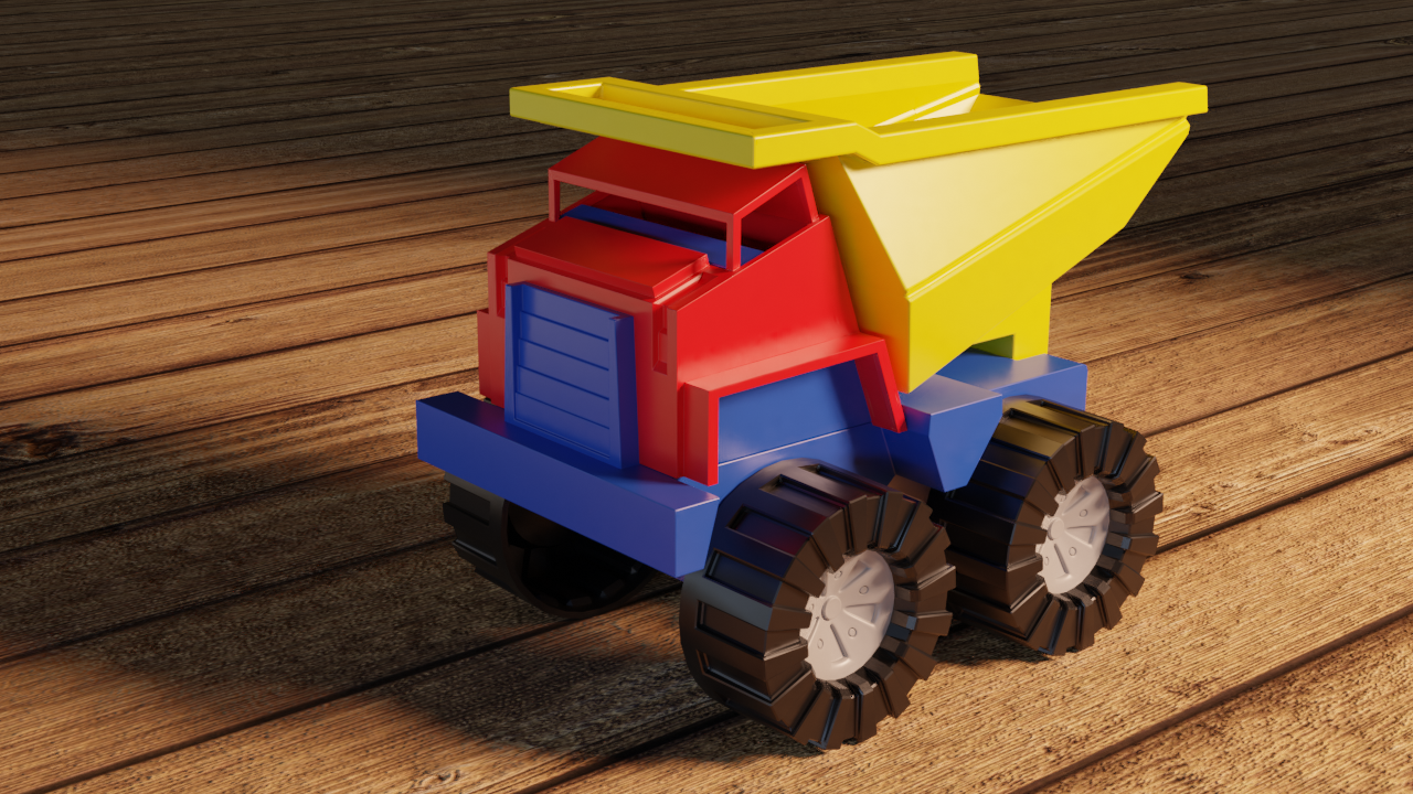 1) The wood floor is too rough compared to the brand-new toy nature of the truck. If my wood floors looked like this in my house - all the finish worn off and the wood grain popping out this much - I'd be calling a floor refinisher ASAP. So I'd recommend toning down the wood floor bump map and increasing glossiness for a finished polyurethane look.