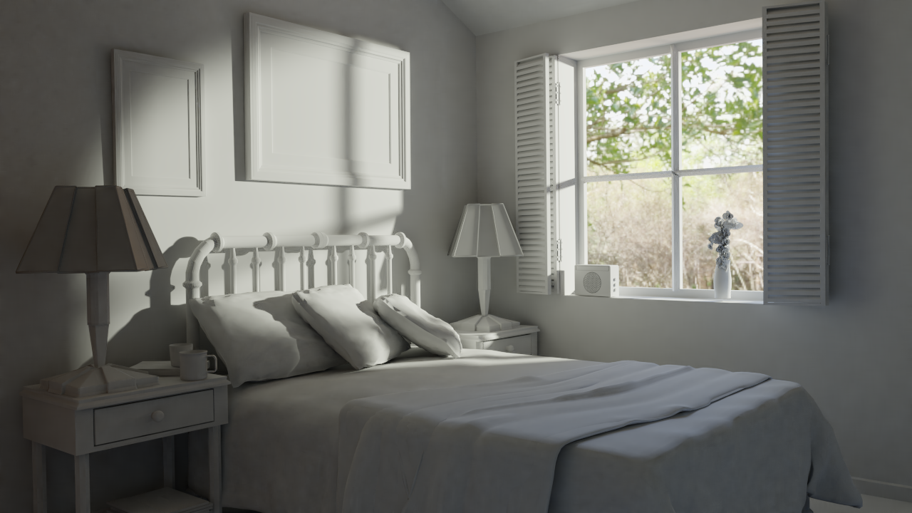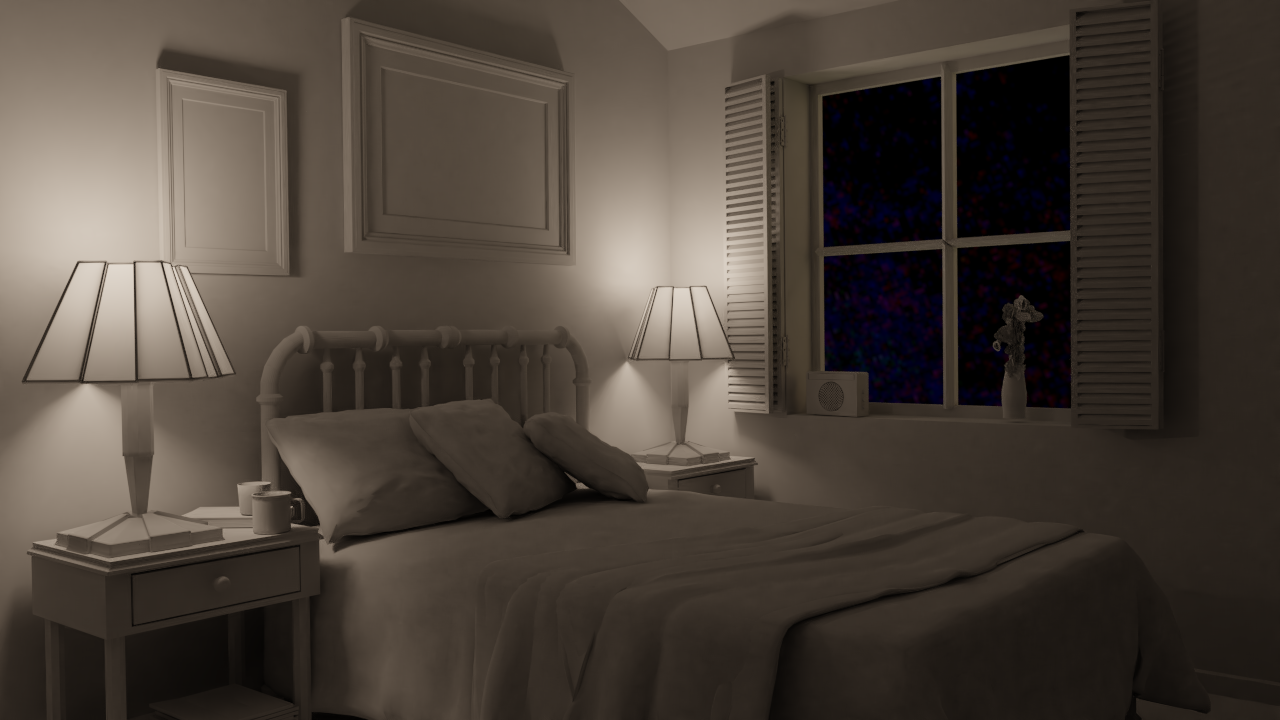 The bedroom scene started out pretty awful - I could not get environment to work - even using Cycles (I have the Mac Eevee problem with backgrounds). I was using 2.8, so decided to go back to 2.79 and it worked much better for both day and night. I think 2.8 hates me ... :)