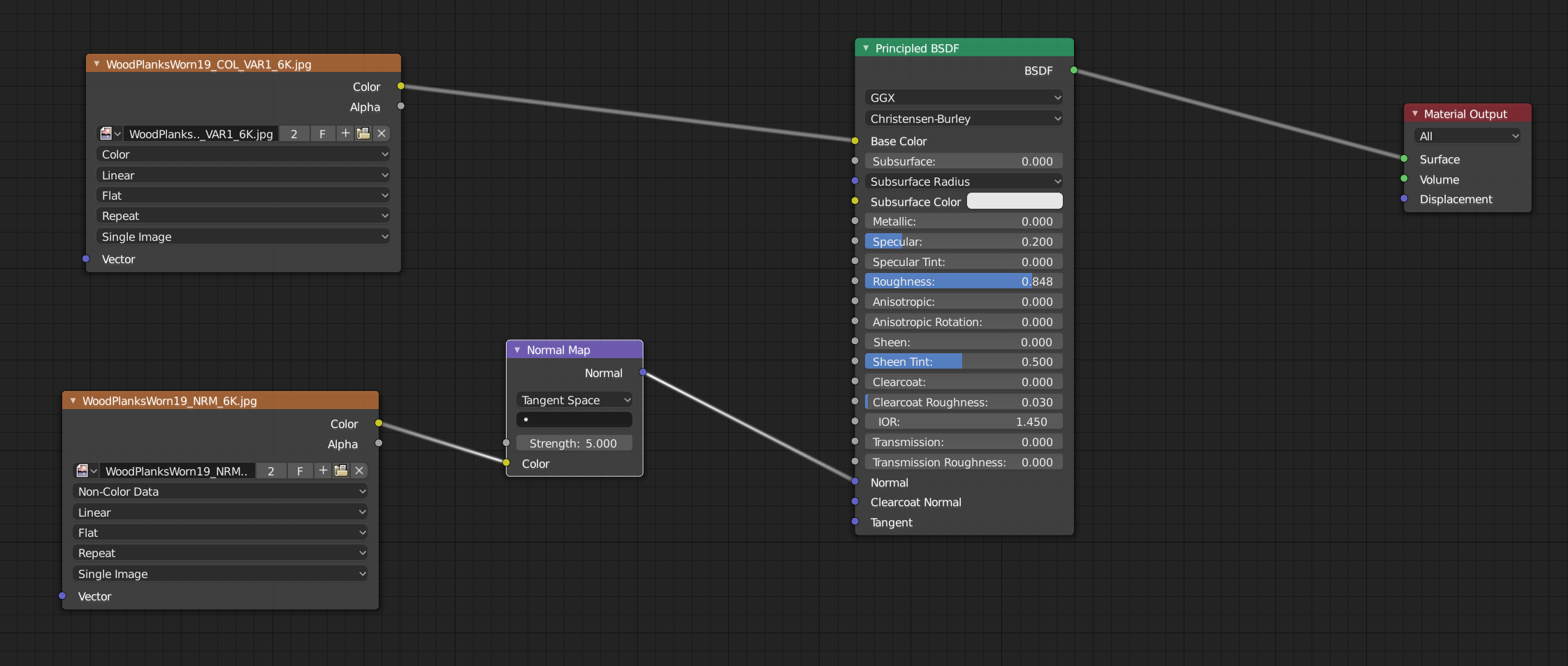 I used the principled shader for the plastic pieces - I will include a screenshot below. Also I have included my setup for the wood. Thank you for your help!