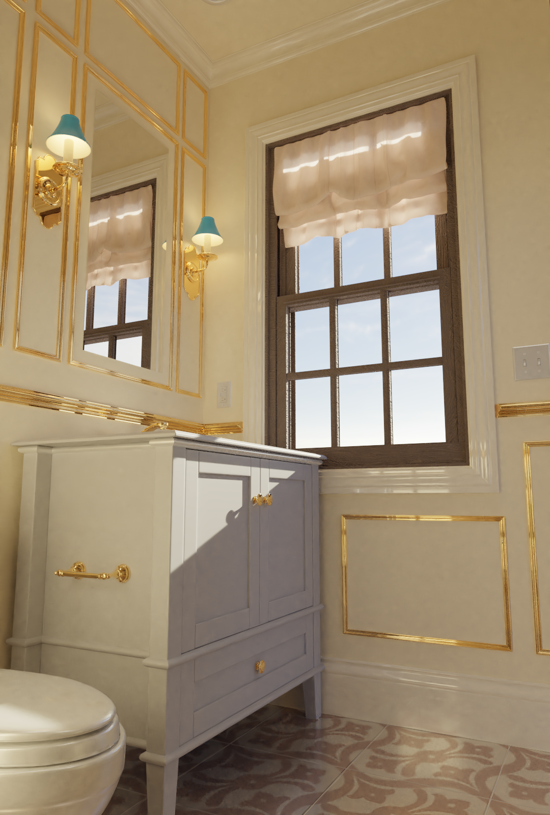 yyukinoh1989 Nice work! There is some splotsiness on the toilet and left side of the cabinet, probably from the denoiser. The white wood is a bit too shiny I think. Floor looks nice, the gold is nice and shiny, good mirror and zo really like the curtains. Great job! 😄👍🏻